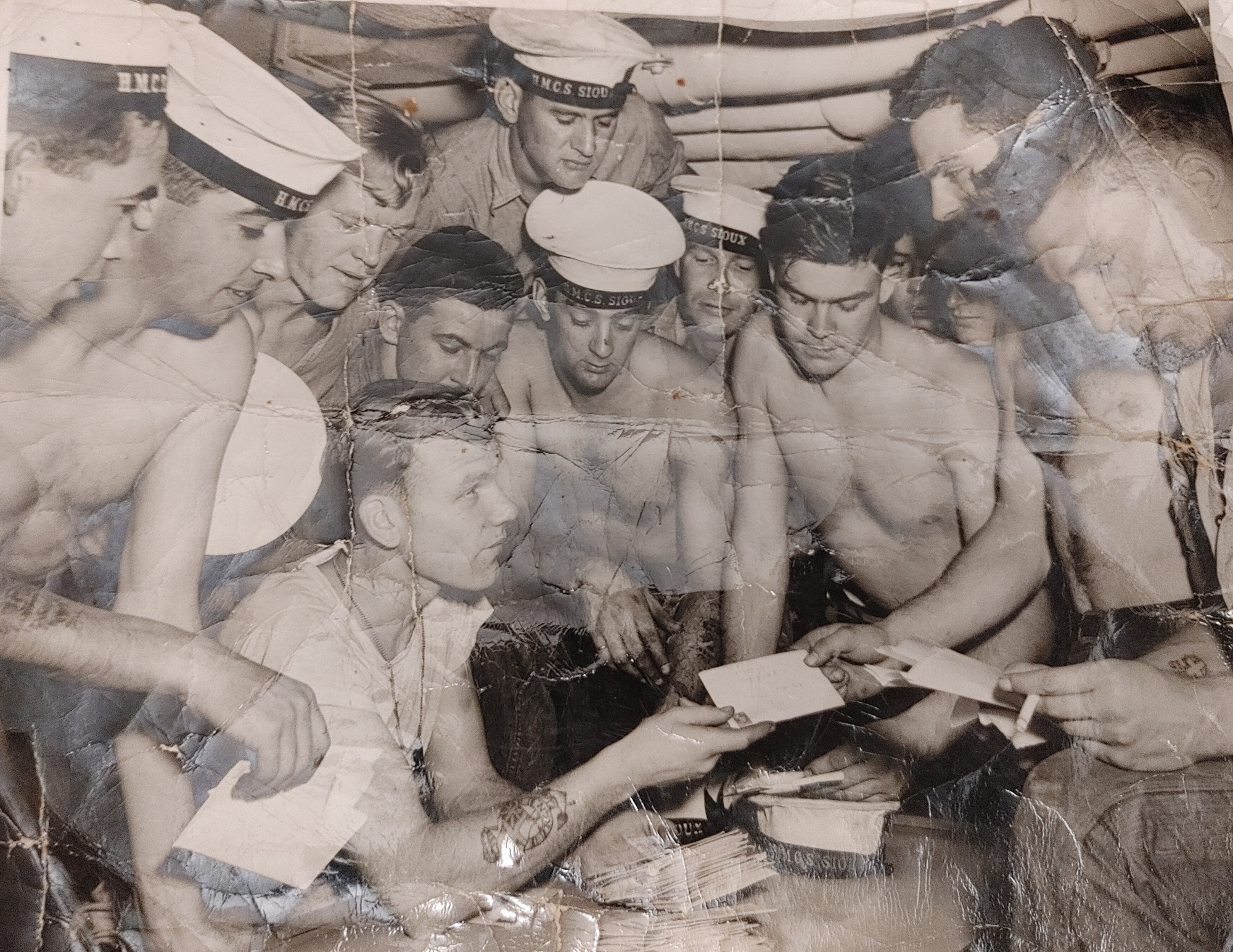 (WP007) HMCS SIOUX R64 - Looking aft down starboard side (WP008) Ray Tilley, Laundry Day, HMCS SIOUX R64 (WP009) Bill Parkin (standing, left) and shipmates on HMCS SIOUX R64 (WP010) Bill Parkin (right) and shipmate on HMCS SIOUX R64 (WP011) Bill Parking on HMCS SIOUX R64