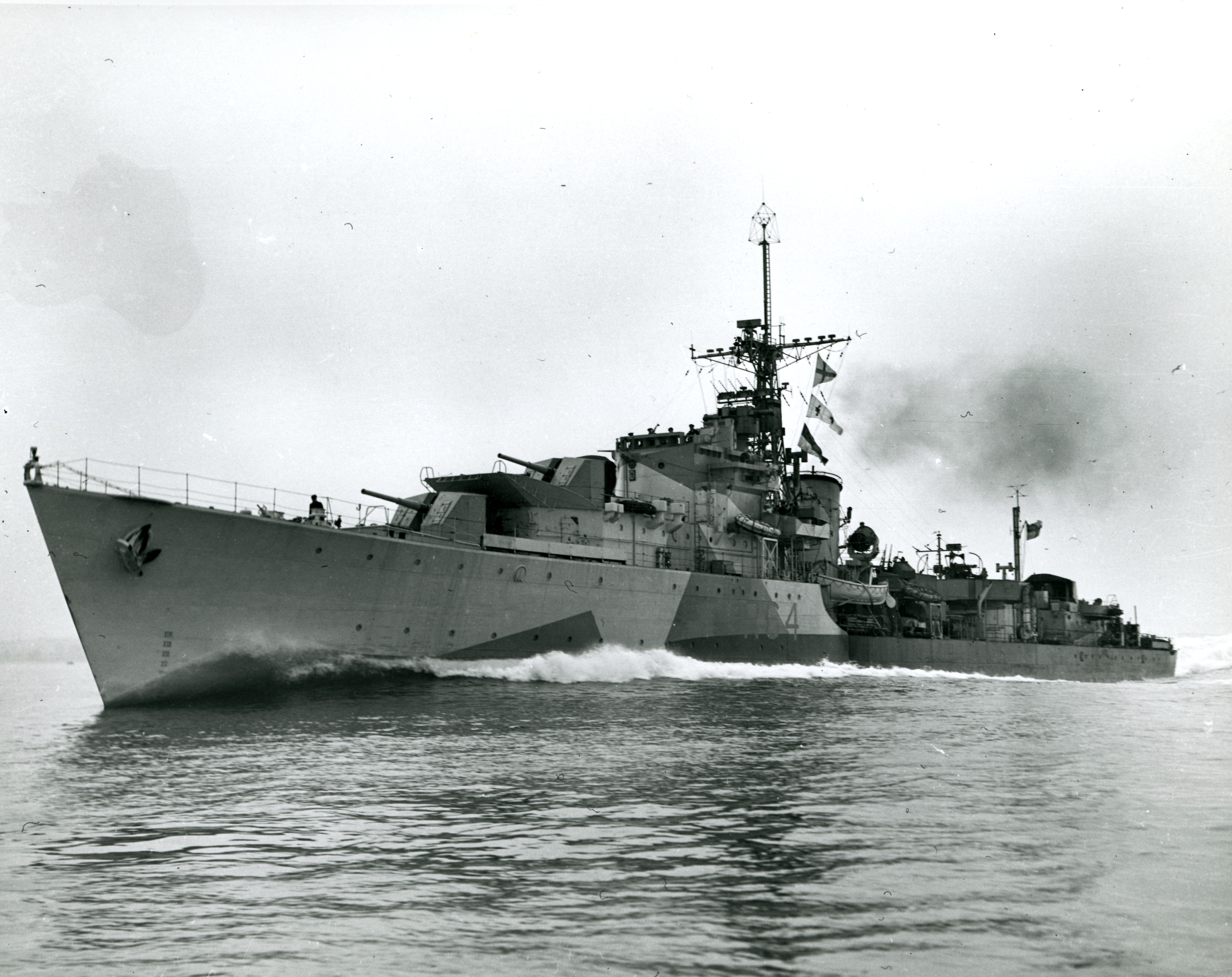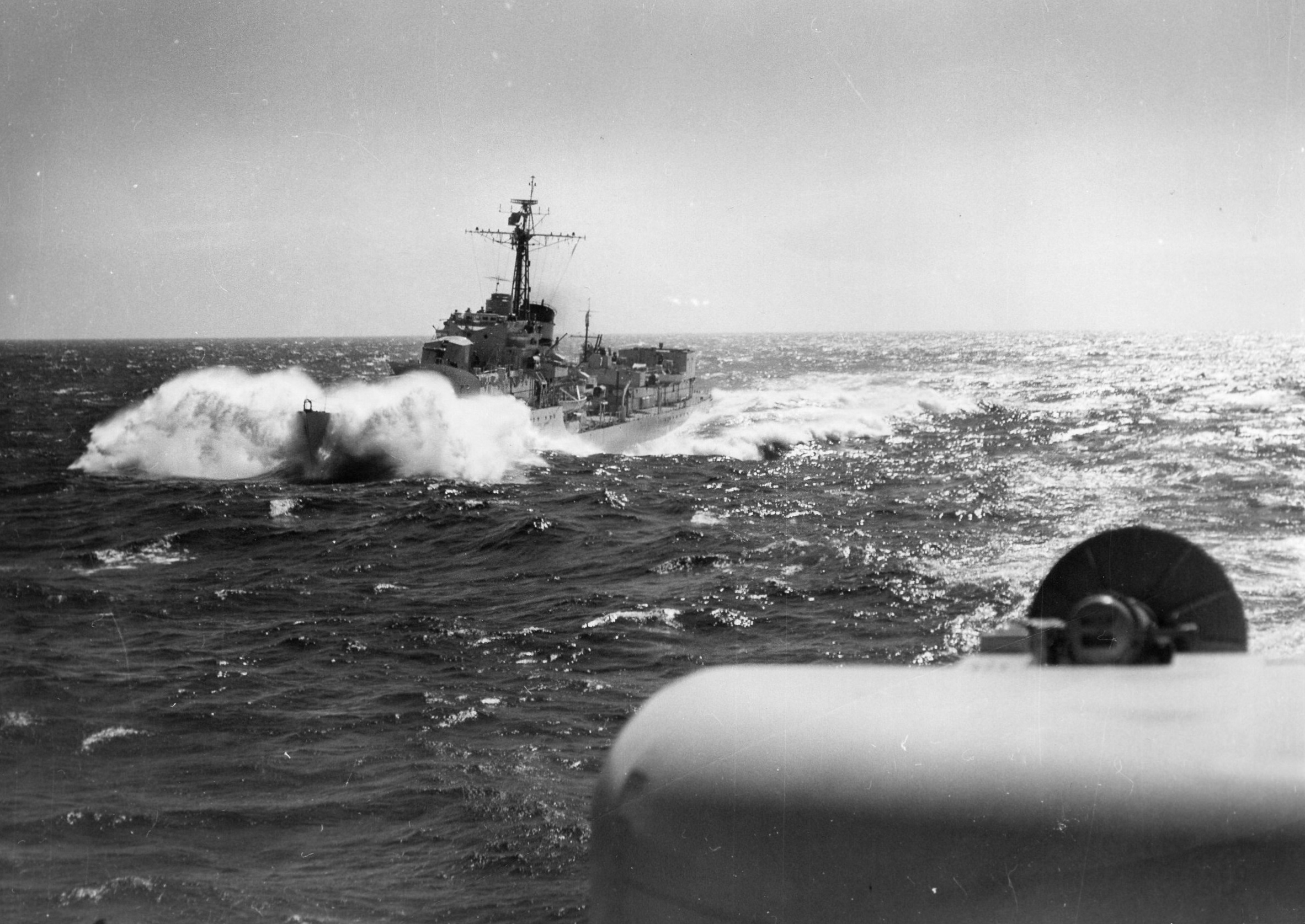 In Nov/Dec 1959, during a 6-week deployment that included a NATO Exercise, HMCS BONAVENTURE, in company with HMCS ALGONQUIN, HMCS IROQUOIS, HMCS SIOUX and, HMCS ATHABASKAN encounter a major storm that battered the squadron. During this deployment, while alongside in Antwerp, HMCS SIOUX lost a crew member who fell overboard in harbour and drowned.