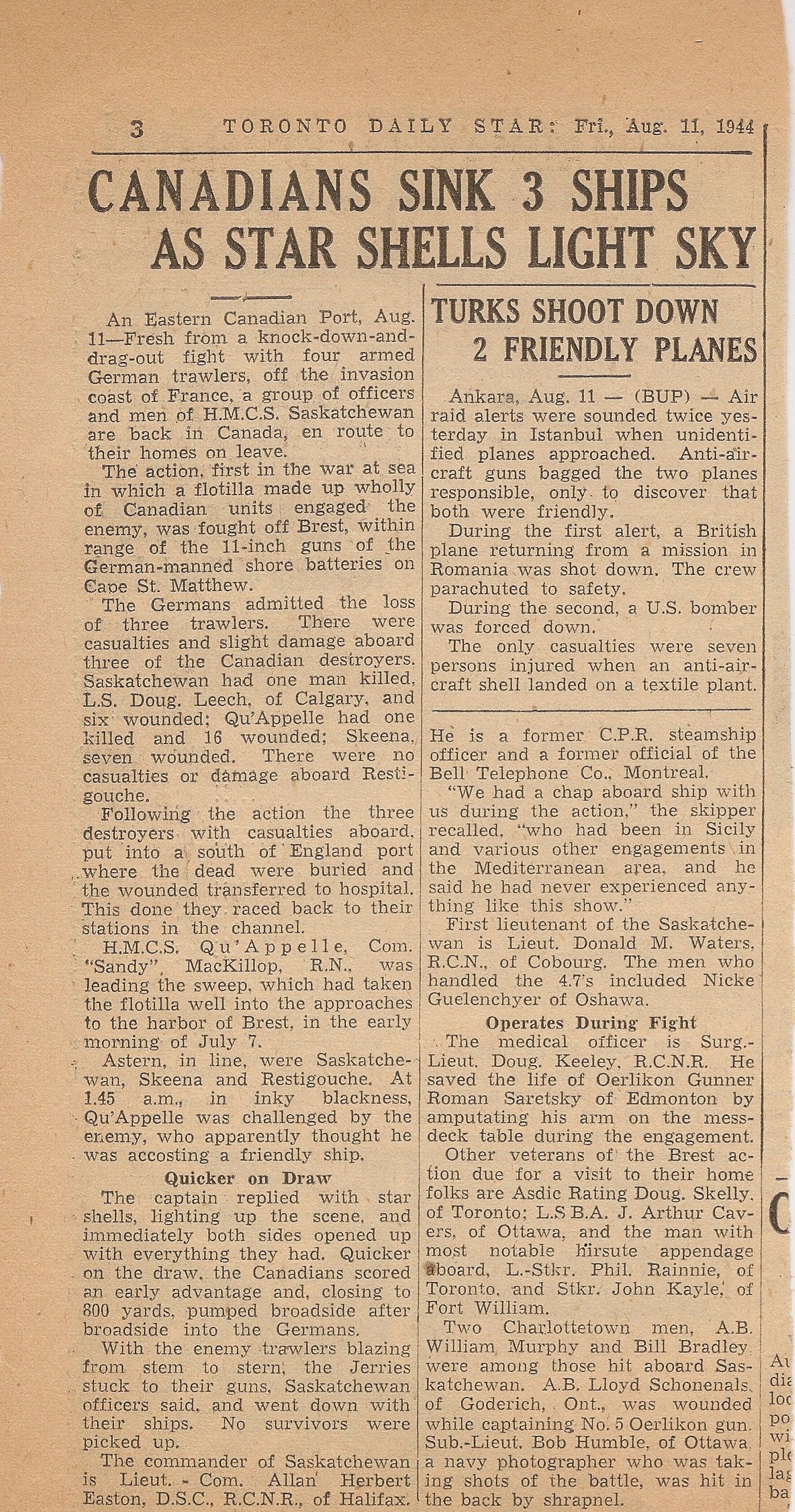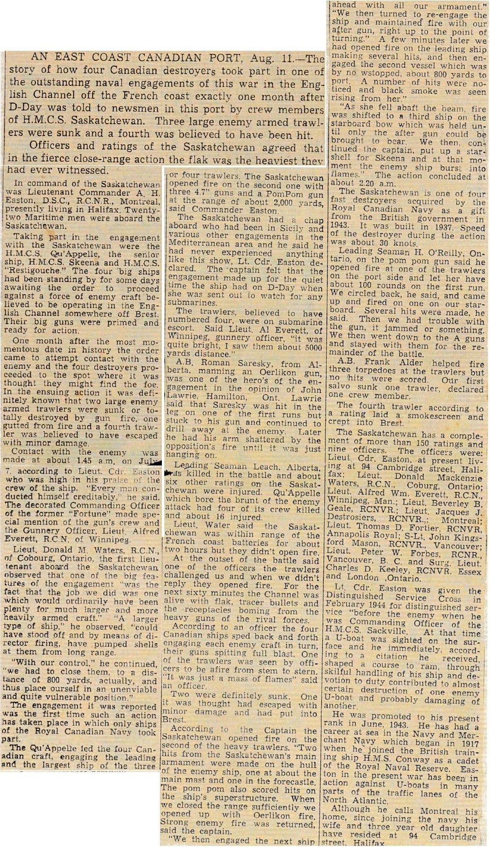 Newspaper articles on operation "Dredger" against German escort vessels at the U-boat meeting points off Brest and southward. During the night of 5/6 Jul the 12th EG, comprising of QU'APPELLE, SASKATCHEWAN, SKEENA and RESTIGOUCHE, attacked 3 patrol boats off Brest.