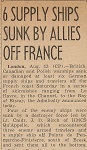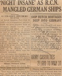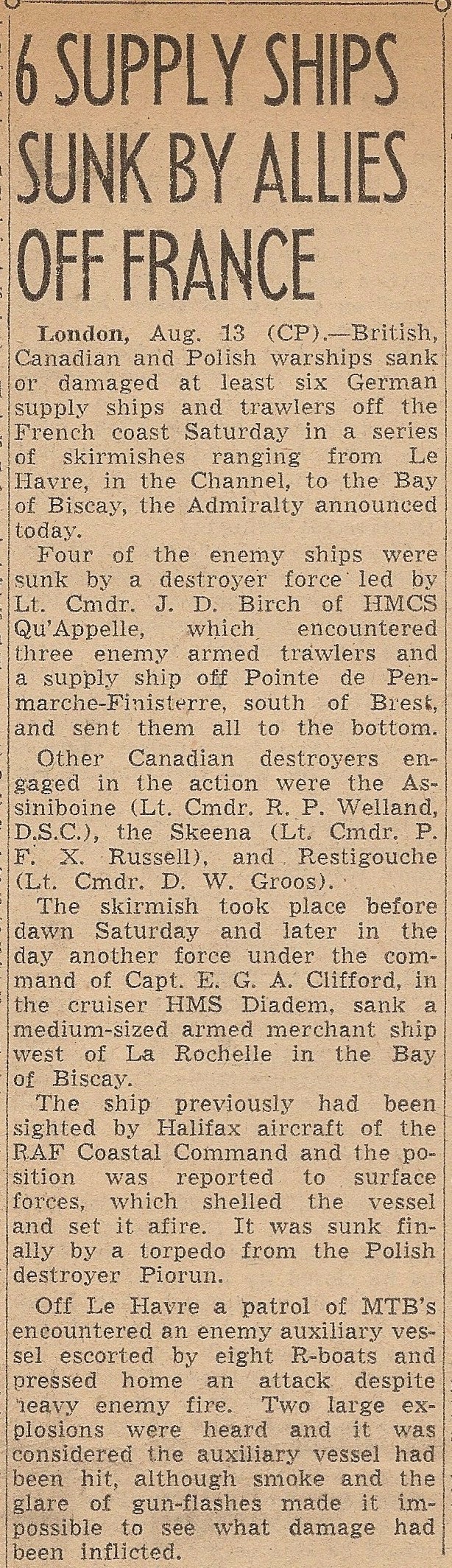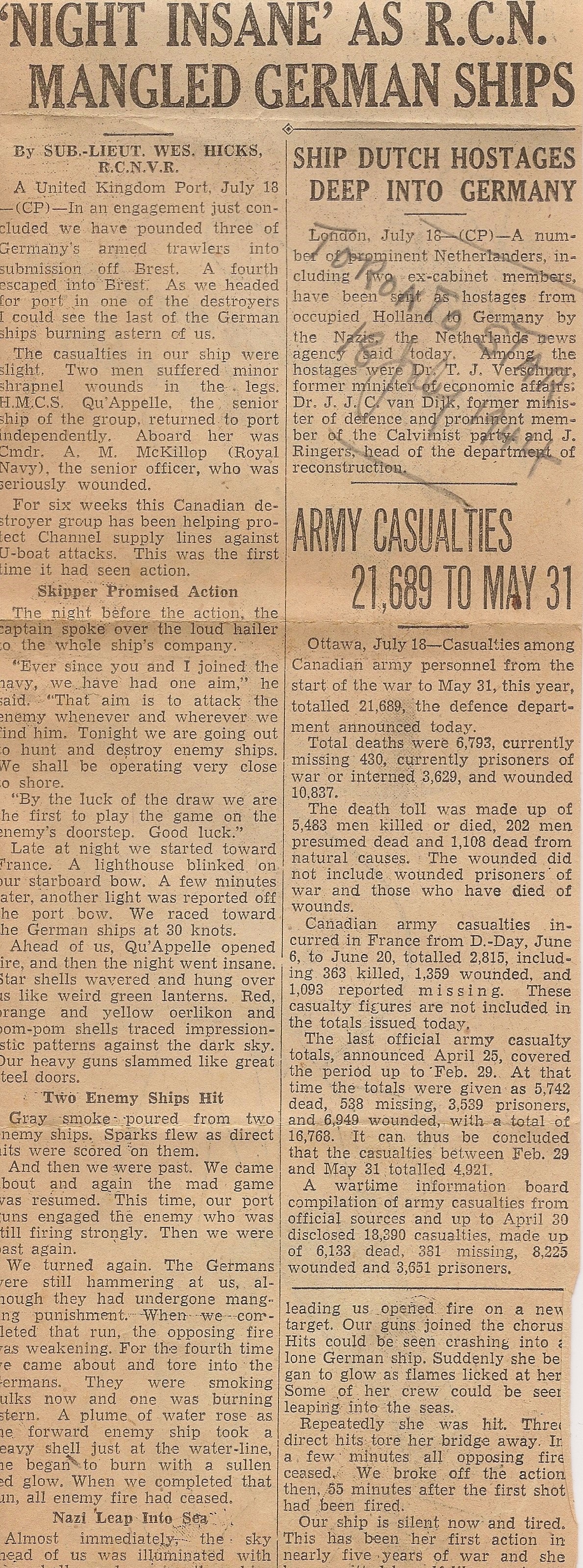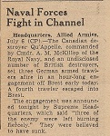 (IN01) Night Insane As RCN Mangled German Ships - Toronto Star 18 Jul 1944 (IN02) Canadian Sink 3 Ships As Star Shells Light Sky - Toronto Star 11 Aug 1944 (IN03) 6 Supply Ships Sunk By Allies Off France - undated newspaper article (IN04) Naval Forces Fight in Channel - undated newspaper article