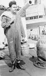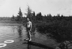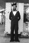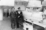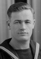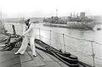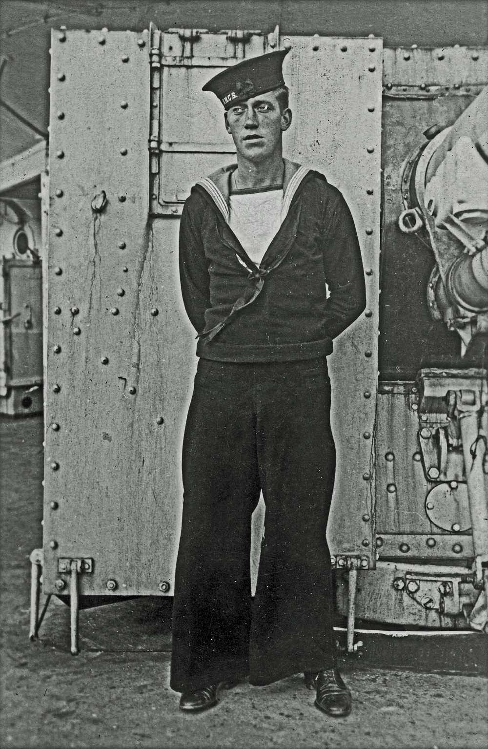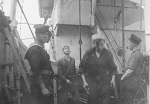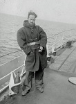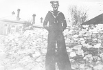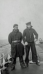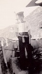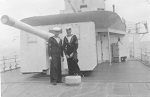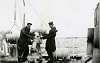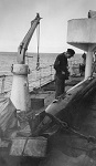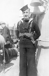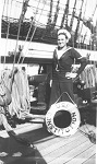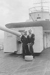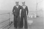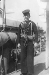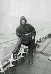 (FH11) Fred Hollands handling a hawser while in his white on the fo'c's'le of HMCS SKEENA. Location possibly St. John's, NFLD (DH12) Mable does his Dhobey on HMCS SKEENA (FH13) Fred Hollands wearing the CO's tunic and cap on HMCS SKEENA (FH14) Frank Hollands, Fred Hollands' brother, aboard HMCS SKEENA. They joined the Navy at the same time (FH15) PO Mullcaster on HMCS SKEENA