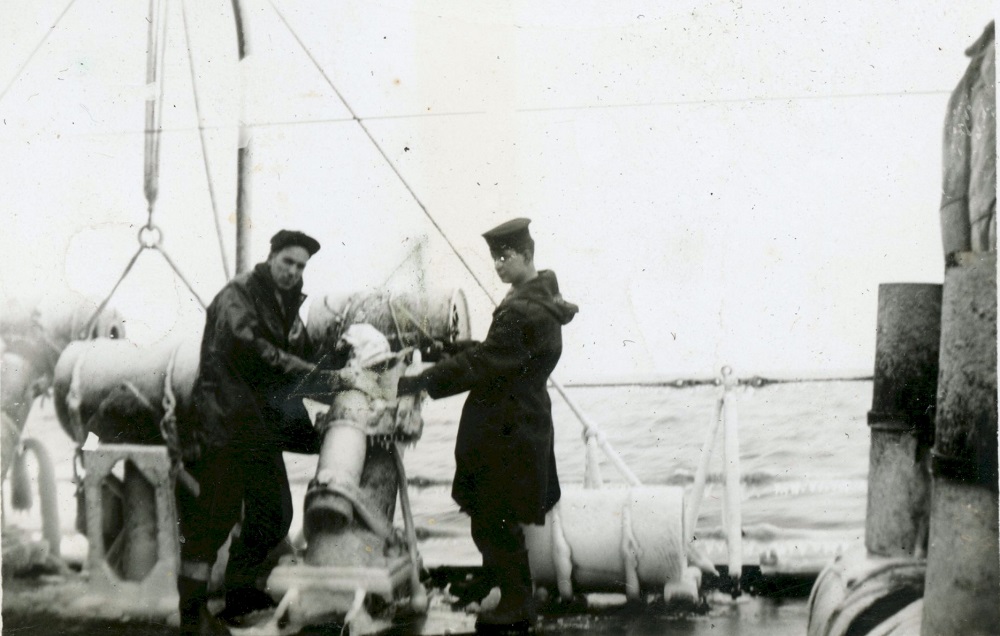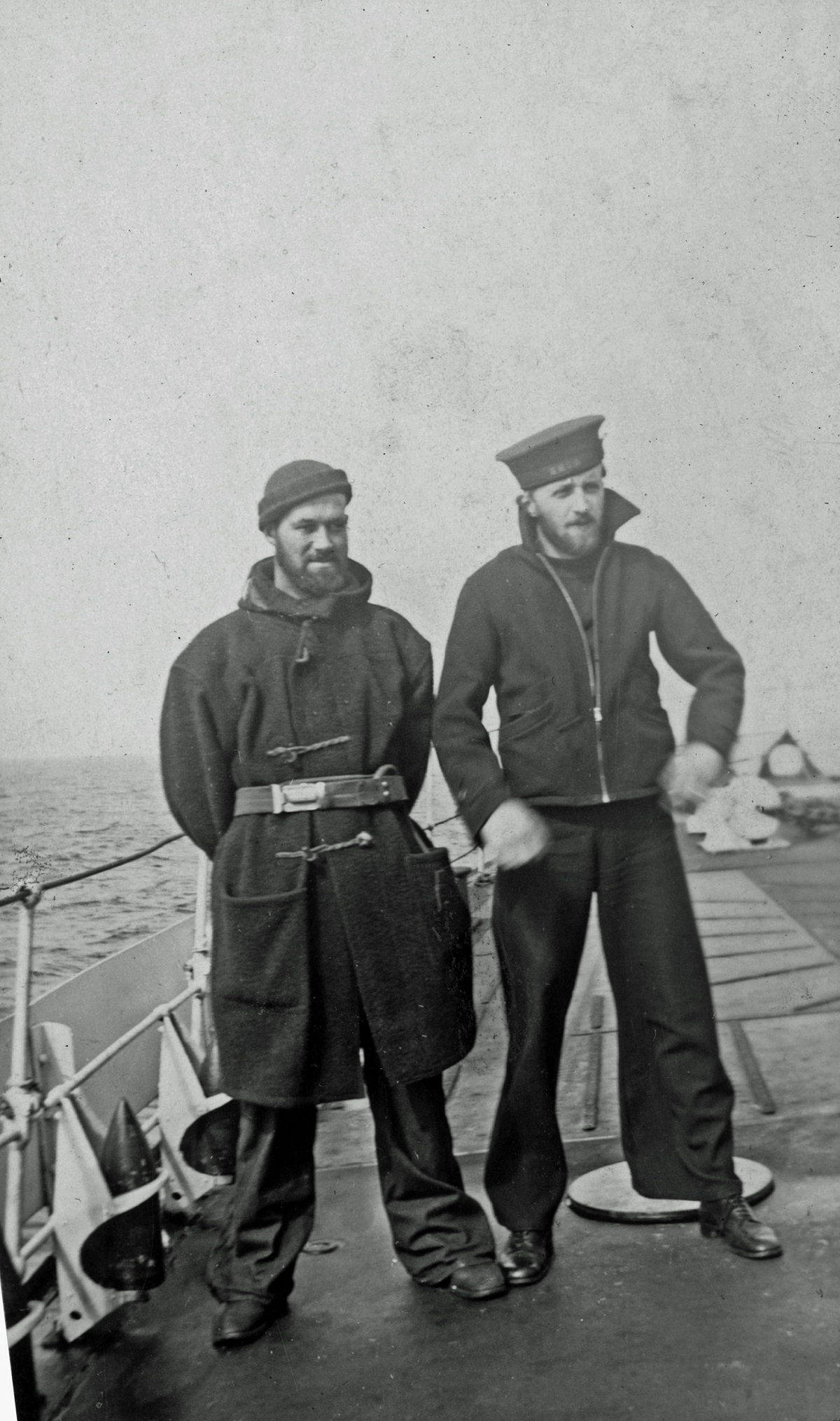 (FH01) Fred Hollands by gun mount on HMCS SKEENA (FH02) Fred Hollands (left) and unknown shipmate by the forward gun on HMCS SKEENA (FH03) A cold day at sea - Fred Hollands (left) and unknown shipmate on the fo'c's'le of HMCS SKEENA (FH04-FH05) Fred Hollands in a duffel coat on the fo'c's'le of HMCS SKEENA