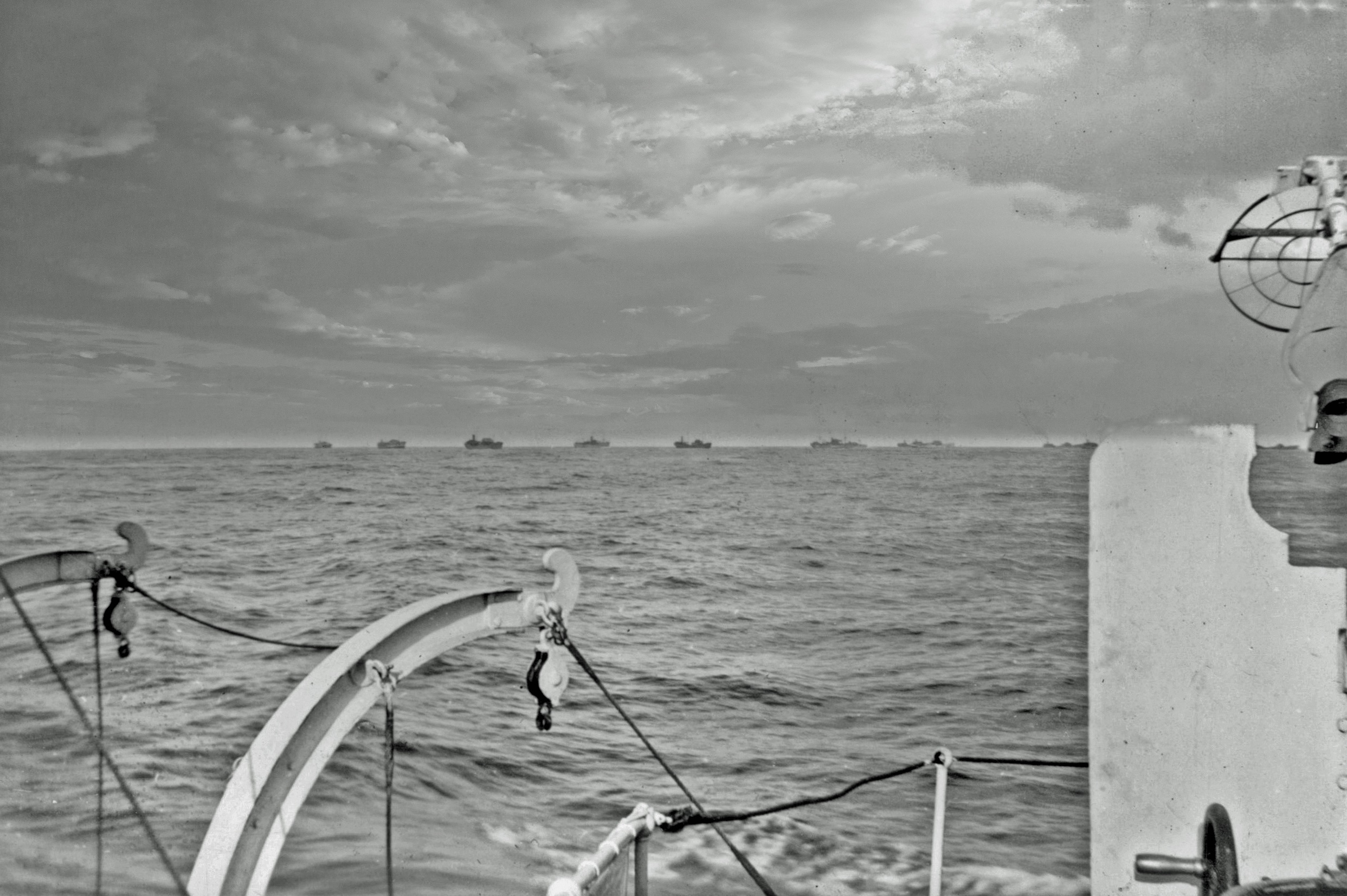 (SK021) A convoy seen from HMCS SKEENA - 1943 // RCN photo 166889-A4 (SK022) Arthur (Daisy) Bell holding HMCS SKEENA'S badge // From the collection of Arthur Bell // Courtesy of Donna Bell-Croft ( SK023) HMCS SKEENA I59 // Courtesy of Roger Litwiller