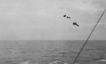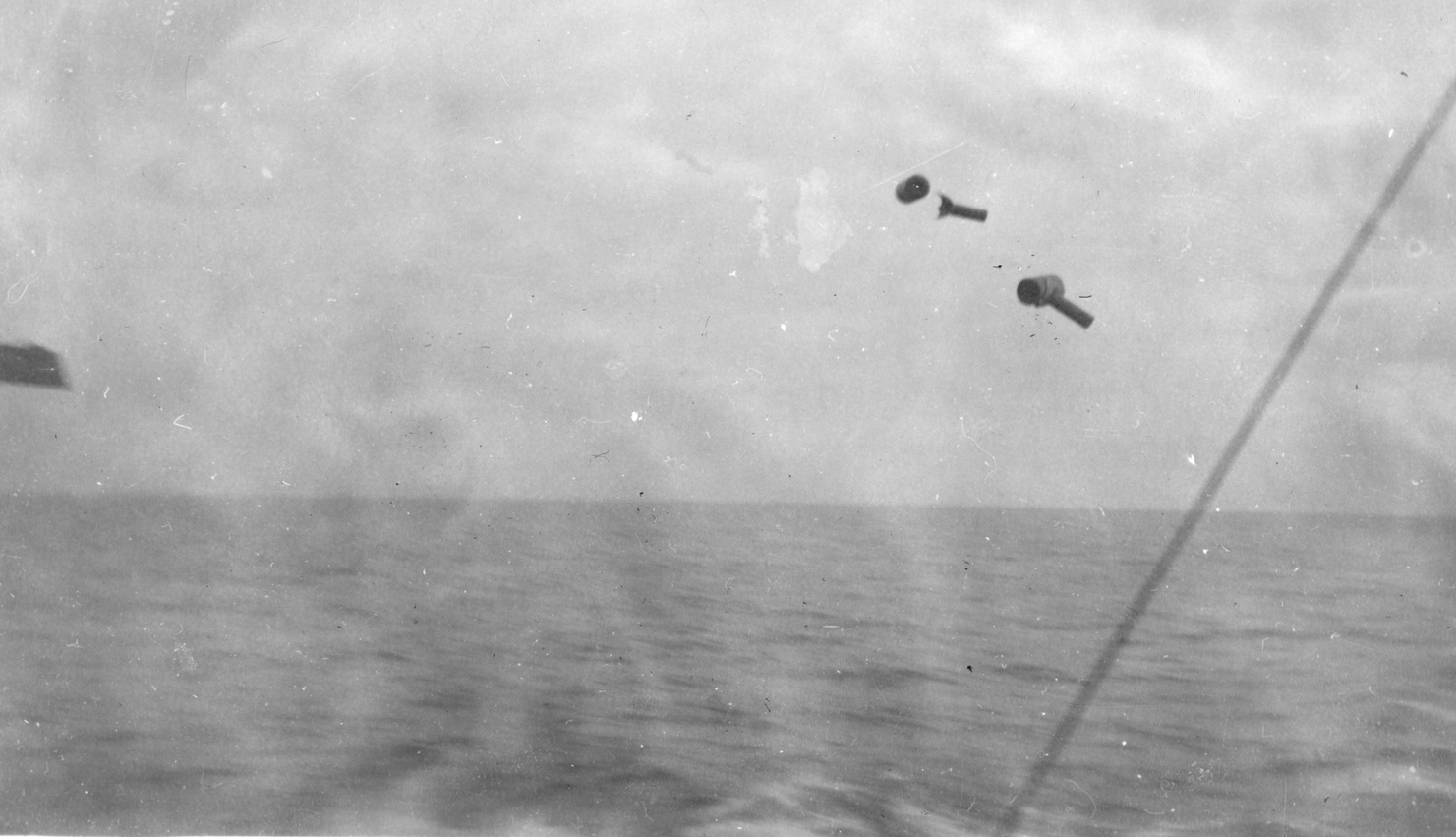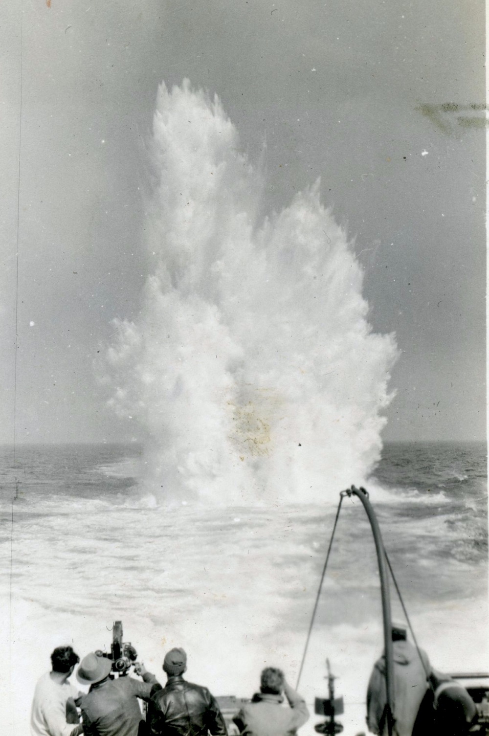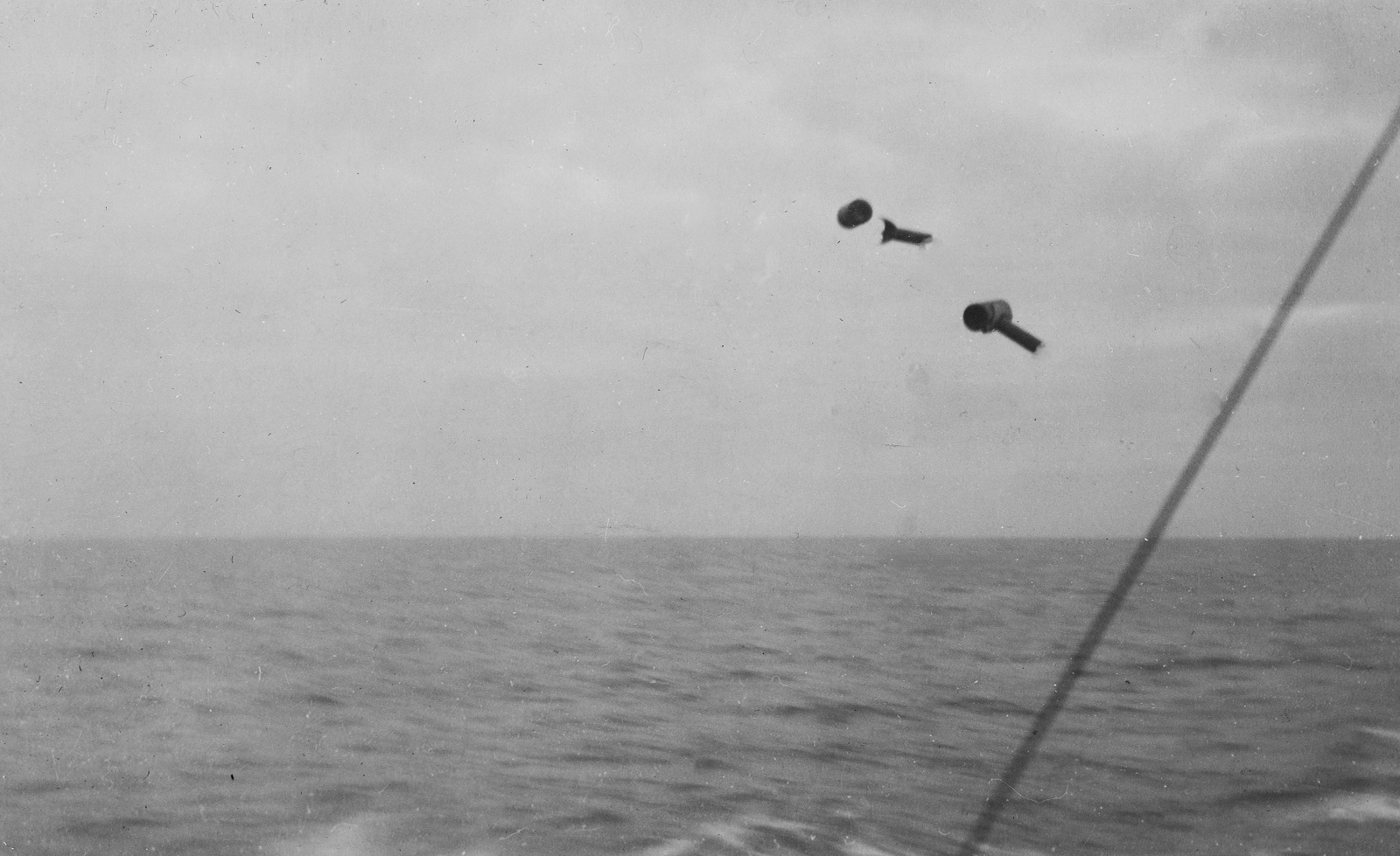 (FH44-FH46) Recovery and inspection of a training torpedo by HMCS SKEENA (FH47) HMCS SKEENA launching depth charges (FH48) Depth charges exploding astern of HMCS SKEENA
