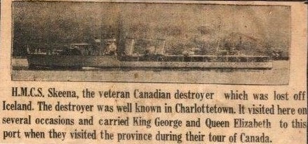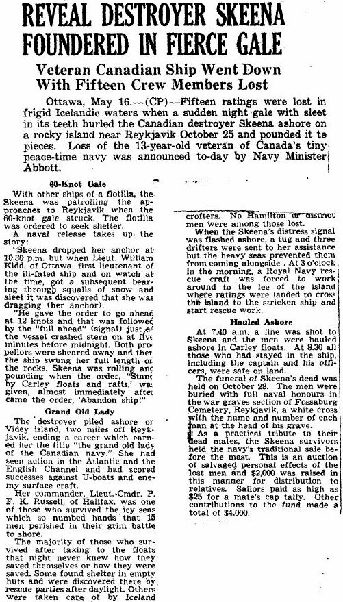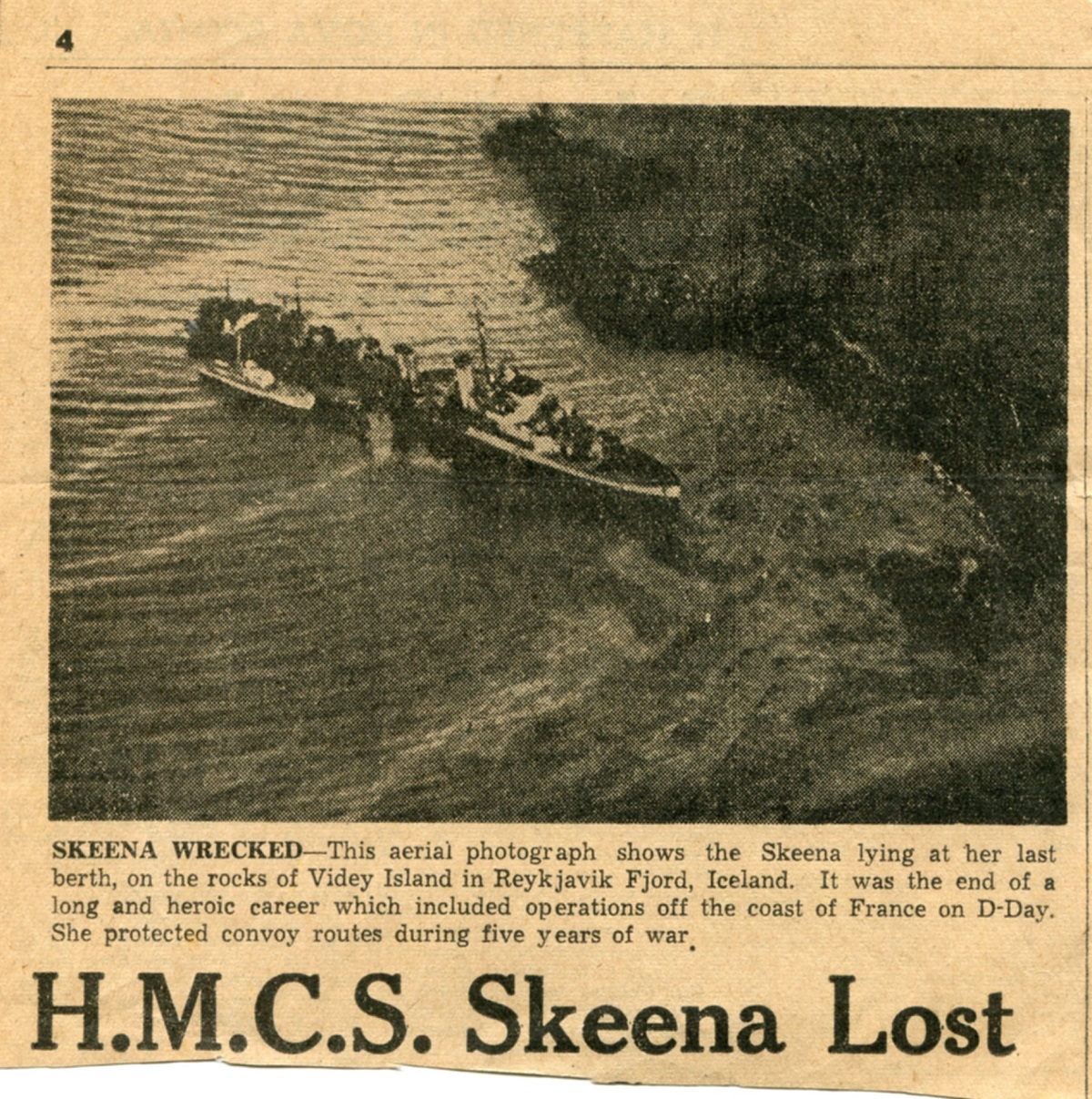 (SK032) HMCS SKEENA hard aground on Vidoy Island. Photo taken by a RN sailor May 1945 (SK033-SK034) Articles on the loss of HMCS SKEENA I59 // From the collection of J. Vincent Wesley, CPO, RCNVR // Courtesy of Marilynn Taylor (SK035) Announcement of the loss of HMCS SKEENA D59 From a Prince Edward Island newspaper // From the collection of John Acorn // Courtesy of Barry Acorn (SK036) Casualty list for HMCS SKEENA from the Globe and Mail, 18 Nov 1944. Note: LS Blais, Joseph Frederic Andree is missing from this list