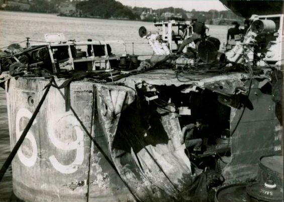 (SKE029) HMCS SKEENA I59 - location unknown // Courtesy of the Naval Museum of Halifax (SKE030) HMCS SKEENA (foreground) on convoy duty // Courtesy of the Naval Museum of Halifax (SKE031) Damage to QU'APPELLE'S stern where she was struck by HMCS SKEENA on the night of 12 Aug 1944 // From the memoirs of Peter Chance, Cdr, RCN, ret'd: We were in line ahead when the order came to reverse course. Thinking we would all turn together Skeena turned what turned to be early. The result was a near head on collision with Qu'Appele which was averted only with a hard a port course change which nearly cleared the stern of QuAppele. Our bow was bent and we limped into Plymouth to the drydock and repair.
