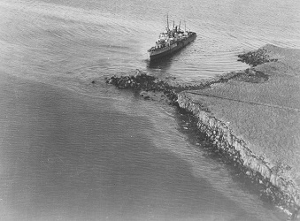 (SK031a-SK031b) HMCS SKEENA aground on Vidoy Island. Deemed unsalvageable she was eventually sold to an Icelandic company in June 1945 and later broken up.
