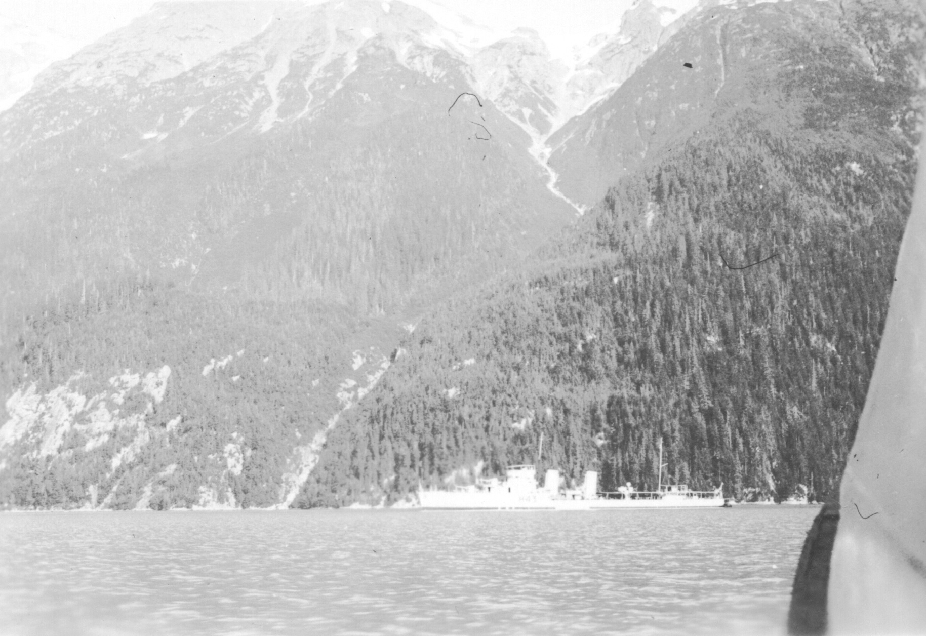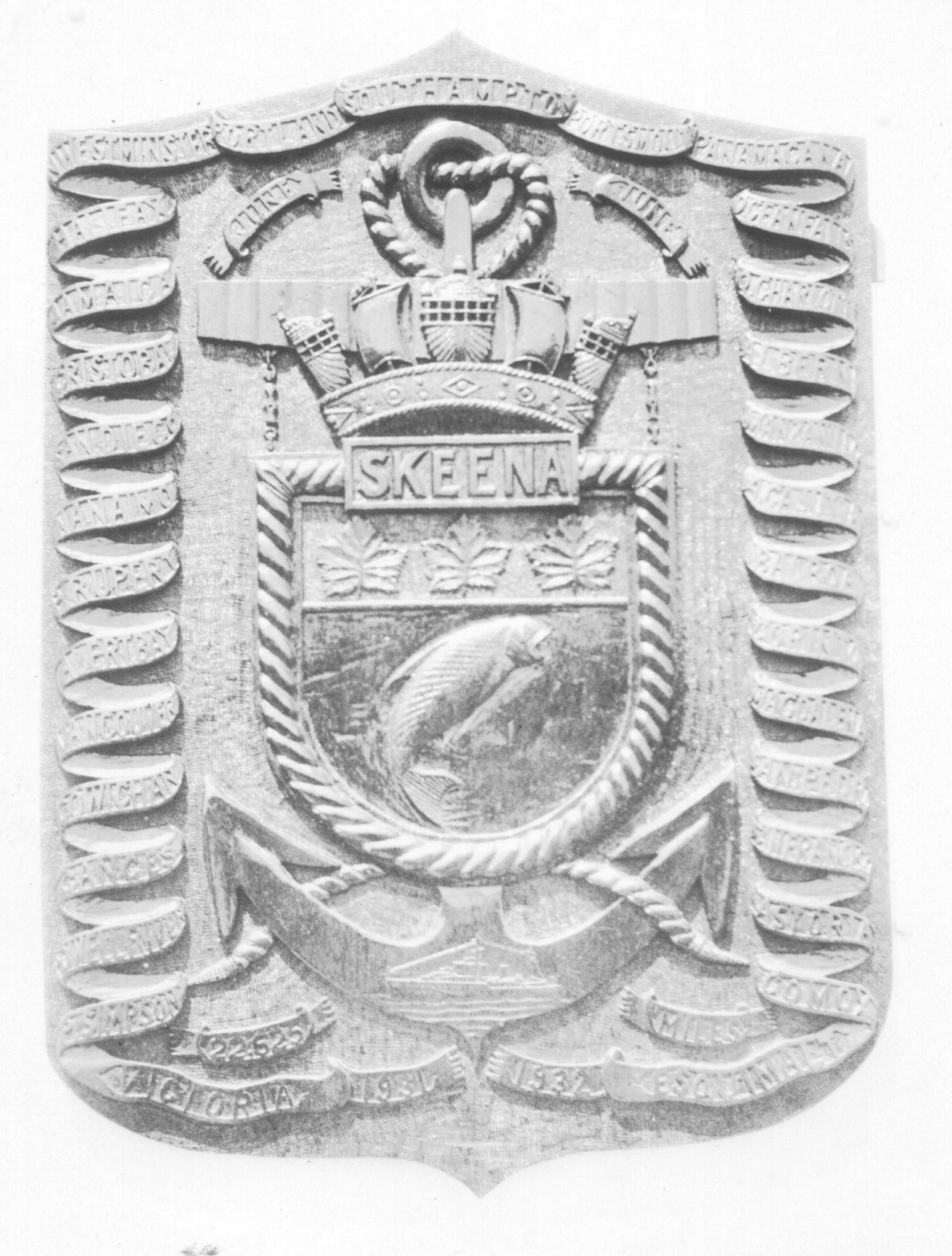 (JD07) HMCS SKEENA at anchor off Alaska (JD08) Chief "Chippy" Claire and Chief Cox of HMCS SKEENA ashore in Alaska (JD09) Carved plaque with the badge of HMCS SKEENA surrounded by her Battle Honours (JD10) HMCS SKEENA'S whaler with 2 unknown sailors on a beach somewhere (JD11) Lance Rutherford (left) and McFayden on HMCS SKEENA