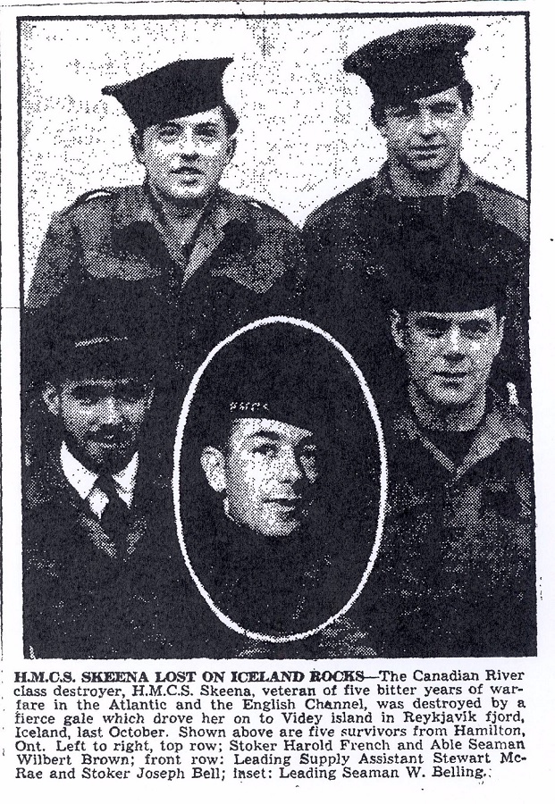 (SK037) newspaper article on the loss of HMCS SKEENA from the Globe and Mail May 17, 1945 (SK038)Newspaper article on the loss of HMCS SKEENA from the Hamilton Spectator, May 16, 1945 (SK039) Article on five survivors from HMCS SKEENA - Sto Harold French, AB Wilbert Brown, L/SA Stewart McRae*, Sto Joseph Bell and LS W. Belling // Courtesy of Kevin Lee // According to his family, L/SA Stewart McRae is L/SA Willard Stewart MacRae