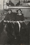 (FM97) HMCS STANDARD COASTER alongside unknown ship (FM98) Unknown sailor on the jetty at McNabb's Island with the catch-of-the-day. The bow of HMCS STANDARD COASTER is visible on the left (FM99) Puppy enjoying a rather large snack on the jetty. Ship's mascot?? (FM100) MacDonald (left) and K. Ross after a bit of fishing off McNabb's Island (FM101) "24 more like these in one hour" MacDonald on the jetty at McNabb's Island