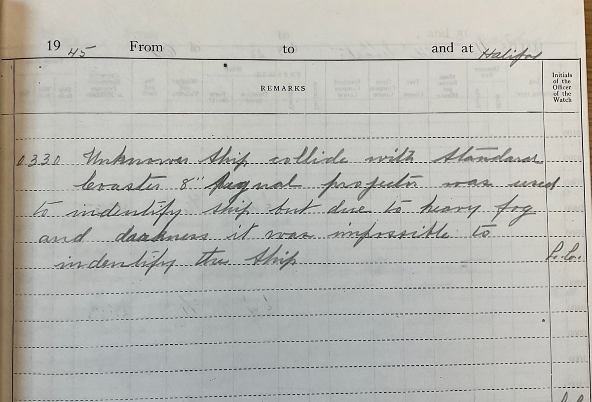 Sometime between 15 Jul 1945 and 13 Oct 1945 HMCS STANDARD COASTER was struck by another vessel in harbour during a heavy fog. The ship's deck log entry reads as follows: "0330 Unknown ship collide with Standard Coaster. 8" signal projector was used to identif ship but due to heavy go and darkness it was impossible to identify the ship"