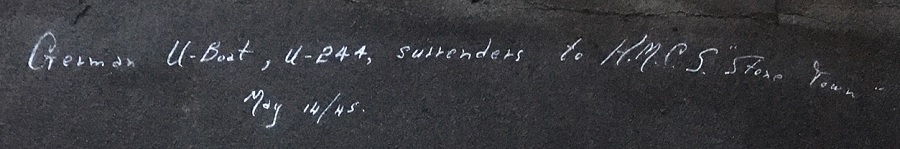 On 12 May 1945 HMCS STONE TOWN sailed from Londonderry as escort to convoy ONS.50 on her way home. On 13 May 1945 a Sunderland aircraft belonging to RCAF 423 Squadron spotted U-244 on the surface ahead of Convoy ONS-50. HMCS STONE TOWN and HMCS HUMBERSTONE were directed to investigate and made initial contact with U-244 before turning her over to HMS LOCH TARBERT and continuing as escort to Convoy ONS 50