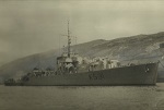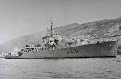 (RS61) HMS REDMILL K554, Lisahalley, Northern Ireland.  On 27 Apr 1945, HMS REDMILL was hit by 2 gnat torpedoes fired by U-1105 and lost 60 feet of her stern.  She was towed to Lisahalley by HMS RUPERT K561  (RS62) HMS ENCOUNTER H10  (RS63) HMCS EDMUNDSTON K106  (RS64) HMCS GUELPH K687