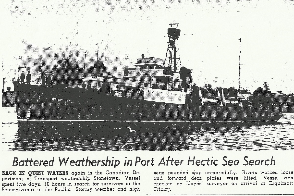 (RS78) Newspaper article date 19 Jan 1952 on storm damage to weather ship CGS STONETOWN after she searched for survivors of the vessel Pennsylvania  (RS79) Weather ship CGS STONETOWN c1957-58  (RS80) Info on CGS STONETOWN