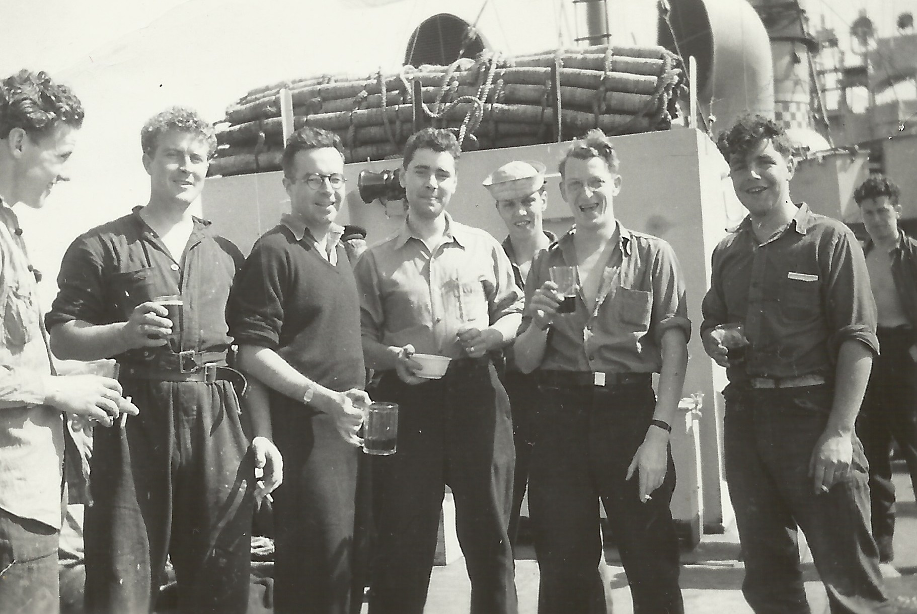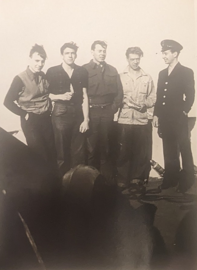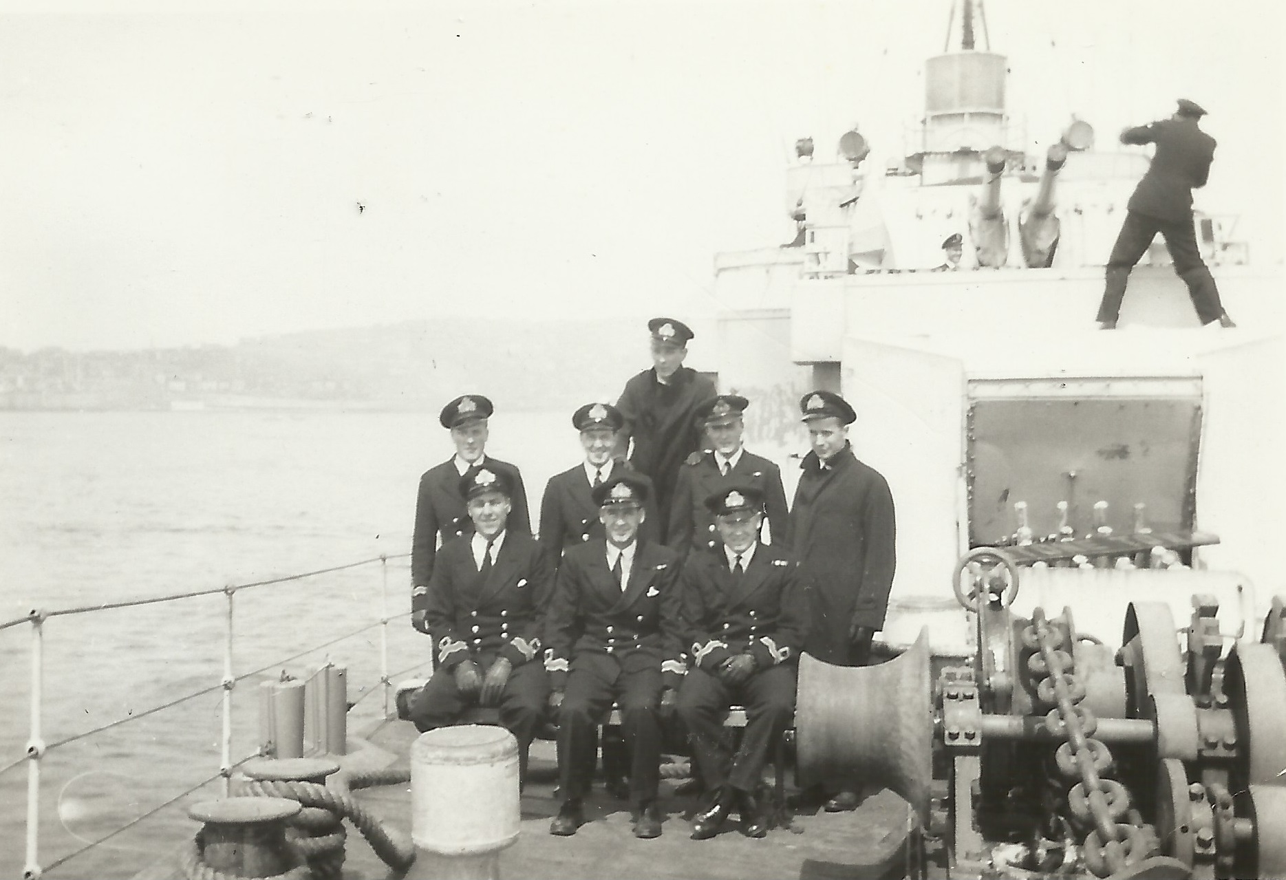 (GW19) George Kearny, Al Rae, Don Larson, Bill Homes, PO Tel Jack Marr on HMCS STONE TOWN K531