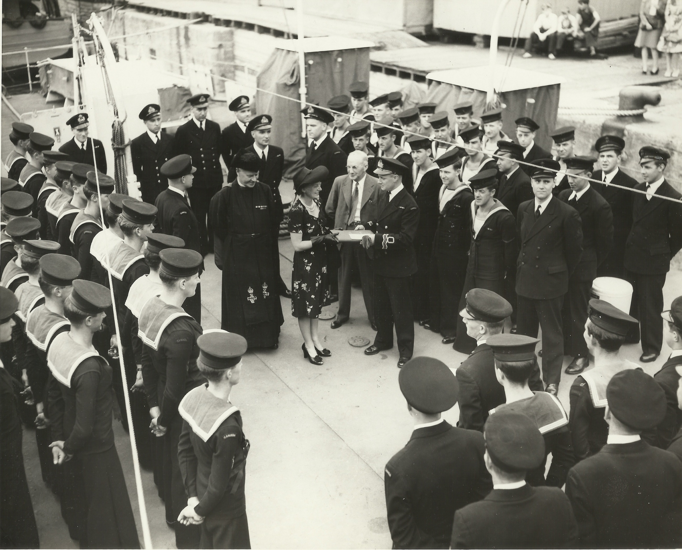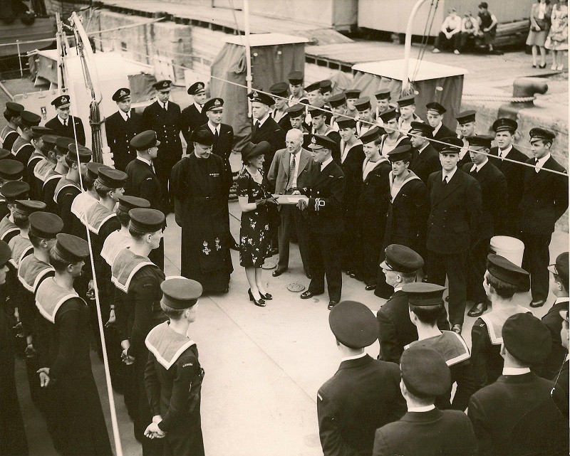 (15) Presentation being made to CO of HMCS STONE TOWN - location either in Halifax or Montreal. John Campbell is behind the woman and the padre, facing forward