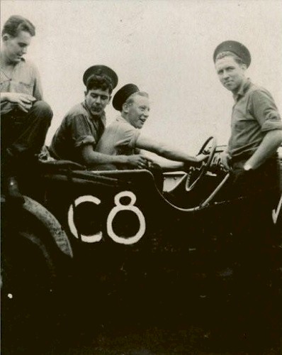 (JC01) The 1915 Lea Francis racing car that was strapped to the HMCS STONE TOWN and hauled back and forth across the Atlantic for fun and frolic in Ireland or the Maritimes  (JC02) HMCS STONE TOWN crew on at the wheel of their 1915 Lea Francis Racing Car. 'C8' was the name of their Atlantic convoy group  (JC03) The 1915 Lea Francis racing car that was strapped to the HMCS STONE TOWN and hauled back and forth across the Atlantic for fun and frolic in Ireland or the Maritimes  (JC04) HMCS STONE TOWN's mascot "Stoney"  (JC05) LCdr John Band, CO HMCS STONE TOWN and Convoy Commodore  (JC06) Unidentified Merchant Aircraft Carrier - photo taken from HMCS STONE TOWN  (JC07) Quarterdeck of STONE TOWN