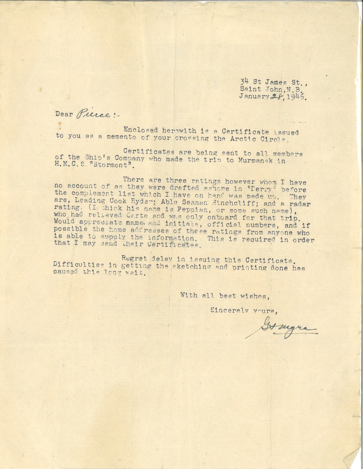 certificate for crossing the Arctic Circle while on board HMCS STORMONT