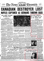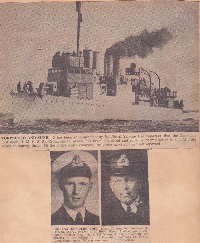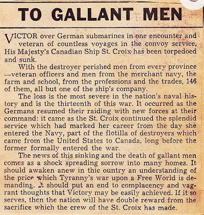 Newspaper article reporting the sinking of HMCS ST CROIX I81