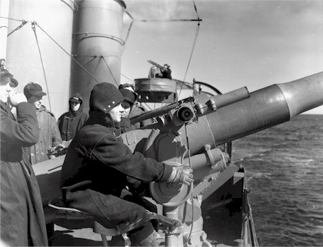 personnel manning a four-inch gun aboard H.M.C.S. ST CROIX at sea, March