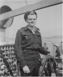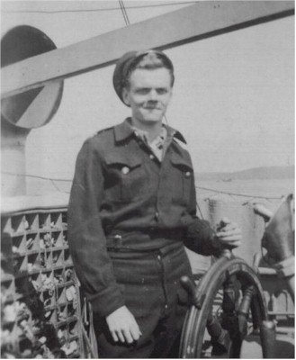 (SDY-V001)Lieutenant G. Eric McAllister in informal battle dress at the ship's helm. Behind him are the bins used for storing signal flags on HMCS SUDEROY V, the ship in which he served during the Second World War. // Source: website - McAllister Genealogy - Under the White Ensign (SDY-V002) Unknown Sailor chipping ice on HMCS SUDEROY V // Source: website - McAllister Genealogy - Under the White Ensign (SDY-V003)HMCS SUDEROY V in rough seas // From the collection of Tel William (Bill) Green, RCNVR // Courtesy of Nancy Johnson (SDY-V004) HMCS LLEWELLYN J278 and HMCS SUDEROY V J05 seen from the sweep deck of HMCS LLOYD GEORGE J279 // From the collection of François Messier, AB, RCNVR // Courtesy of Denis Messier