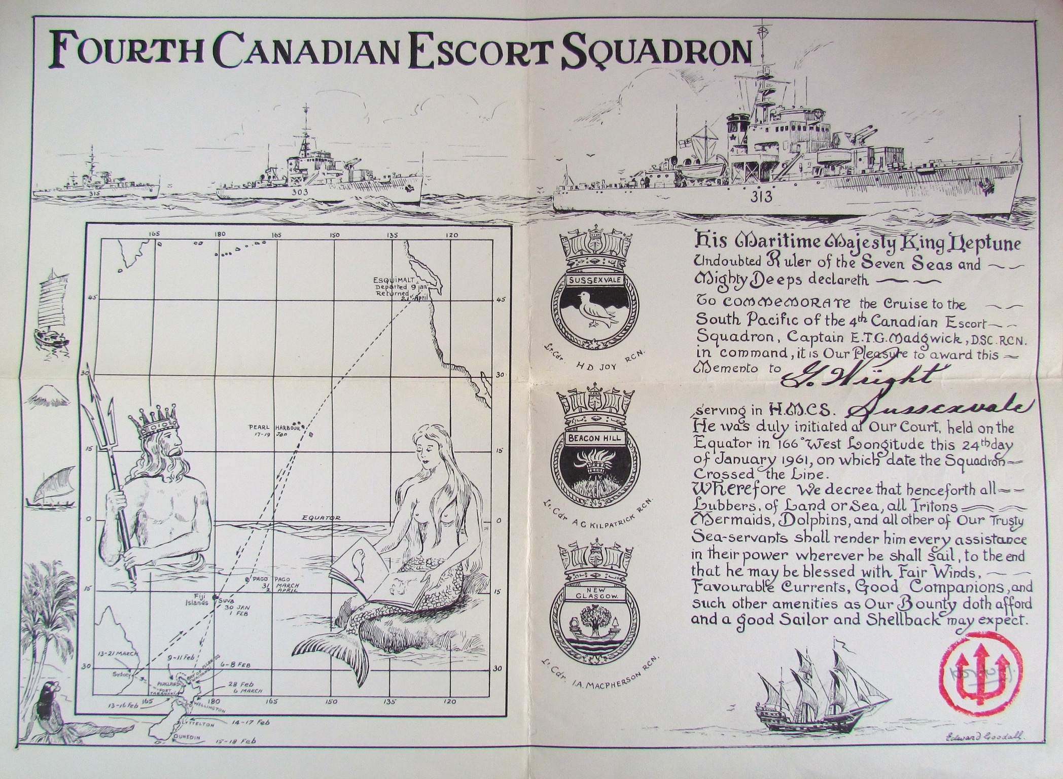 Forth Canadian Escort Squadron Crossing the Line (Equator) Certificate -