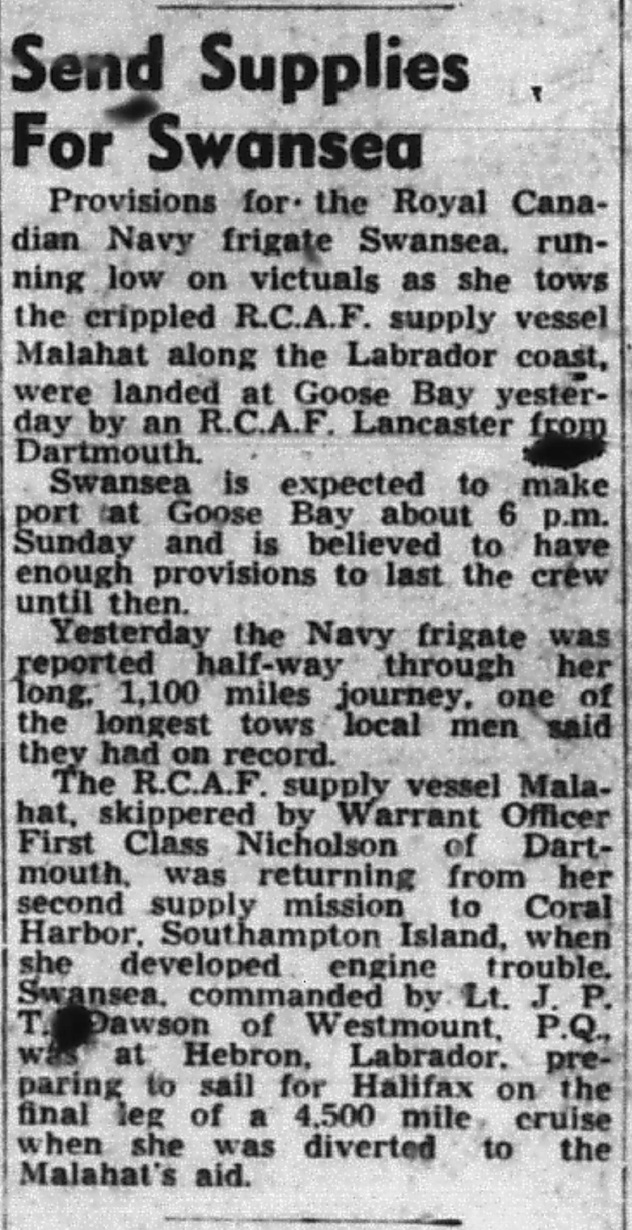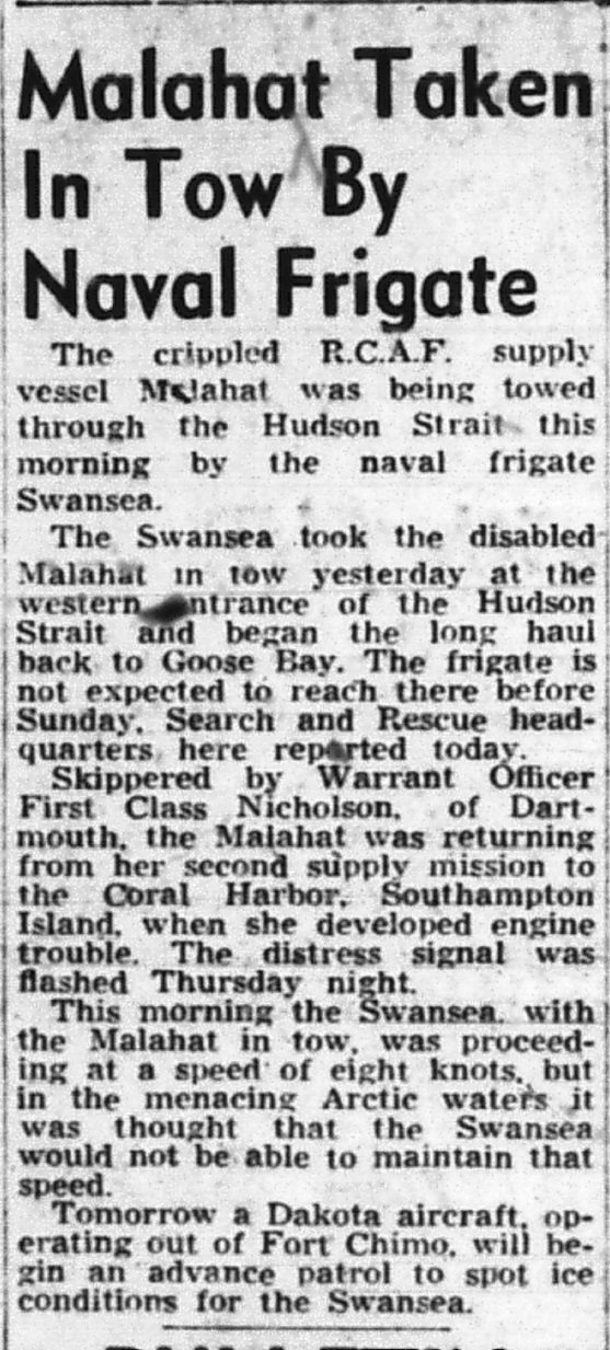 the MALAHAT. On 17 Sep 1949 HMCS SWANSEA took the MALAHAT in tow through the
