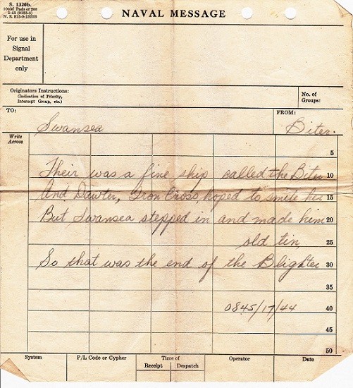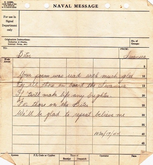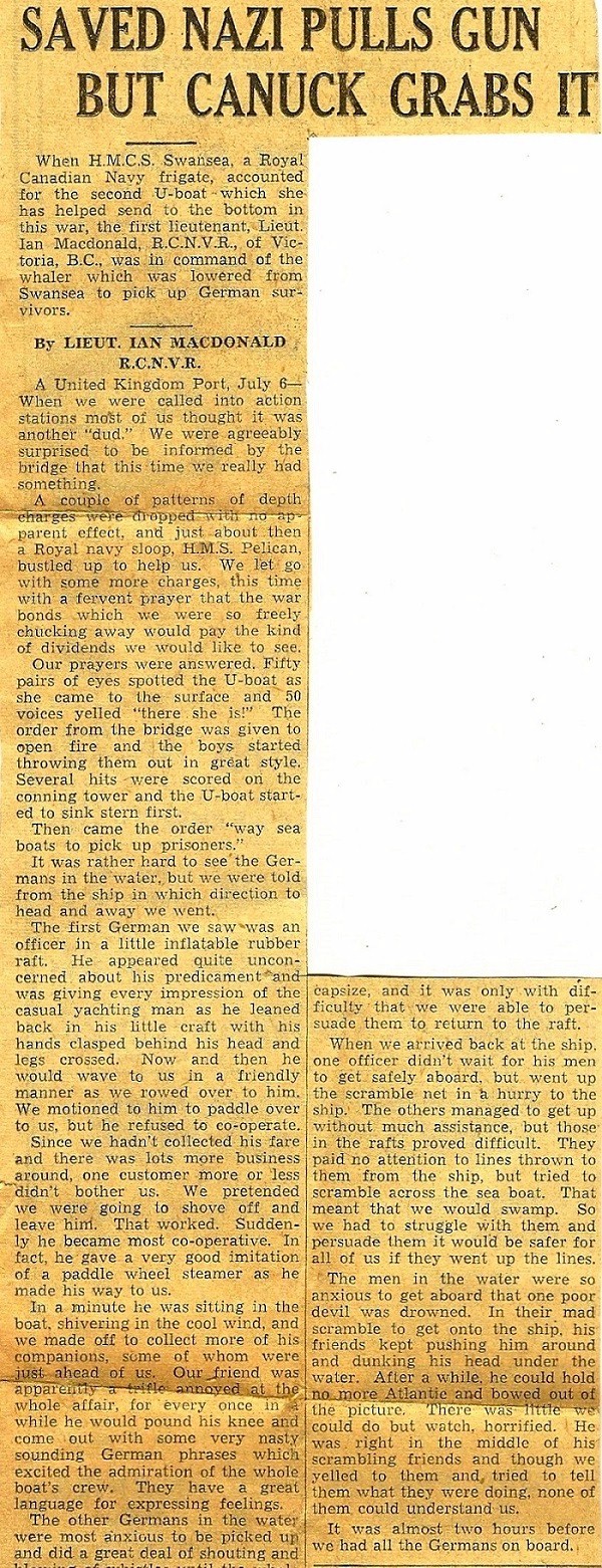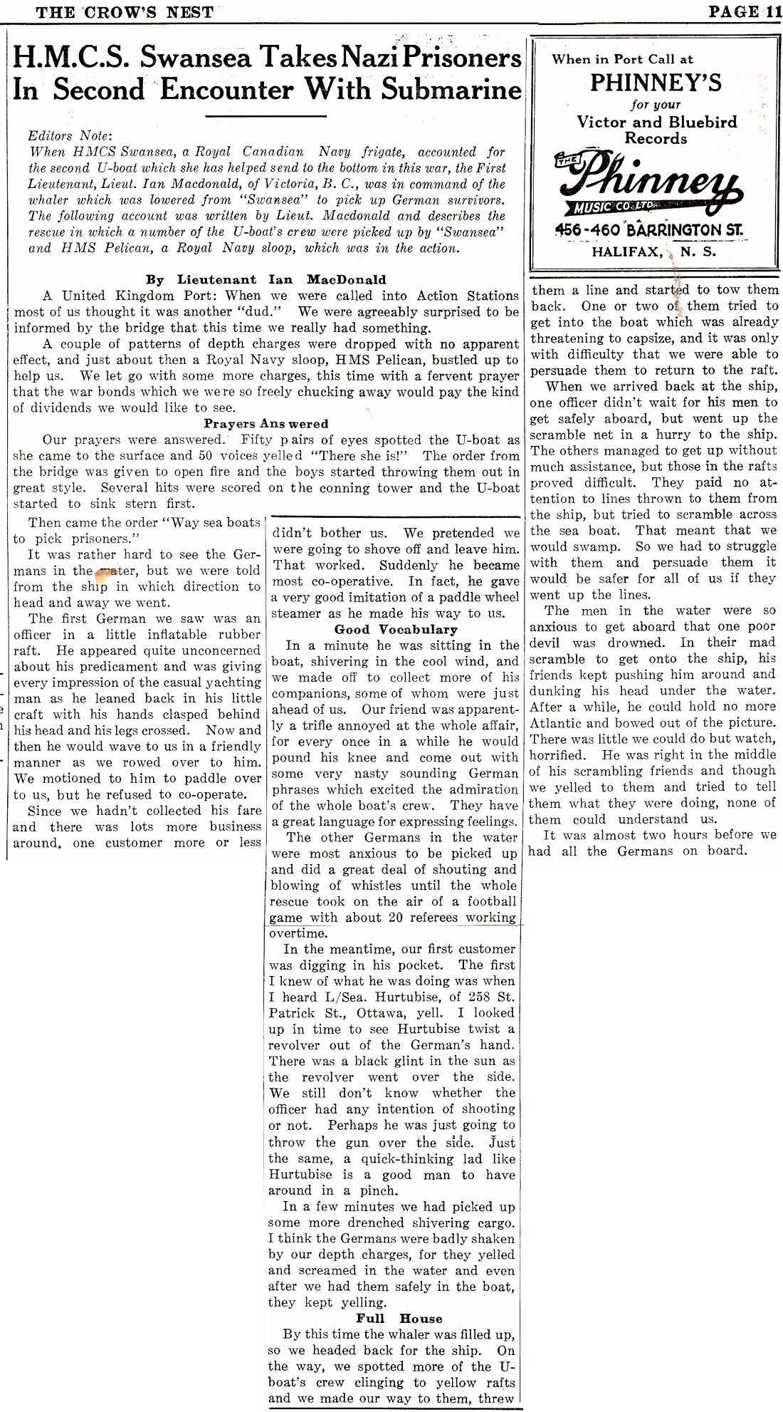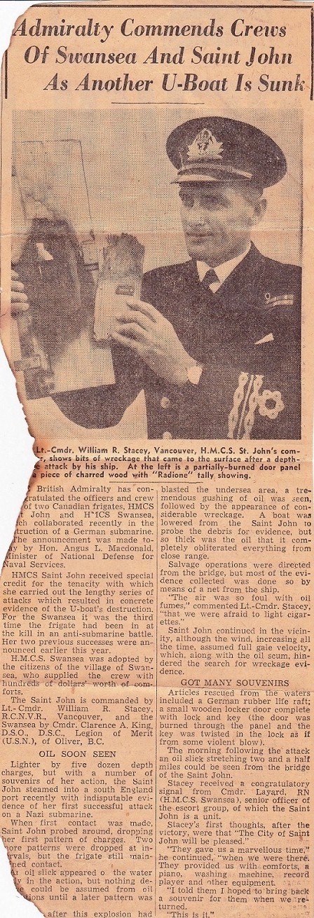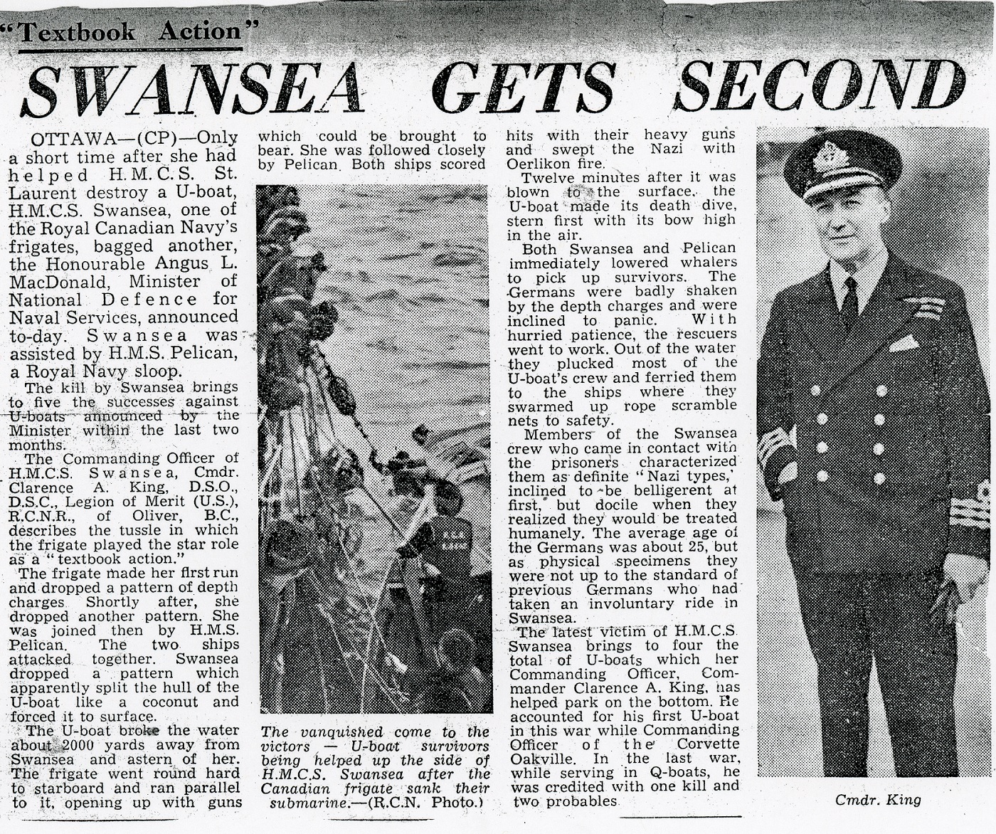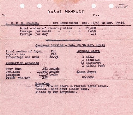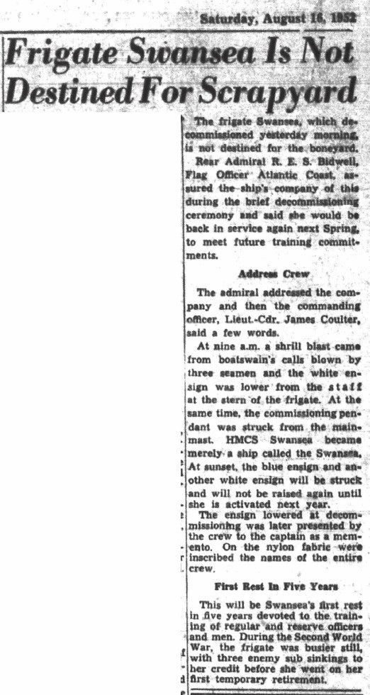 was commissioned at Victoria on 04 Oct 1943, SWANSEA arrived at Halifax on 16 Nov 1943 and worked up off Pictou