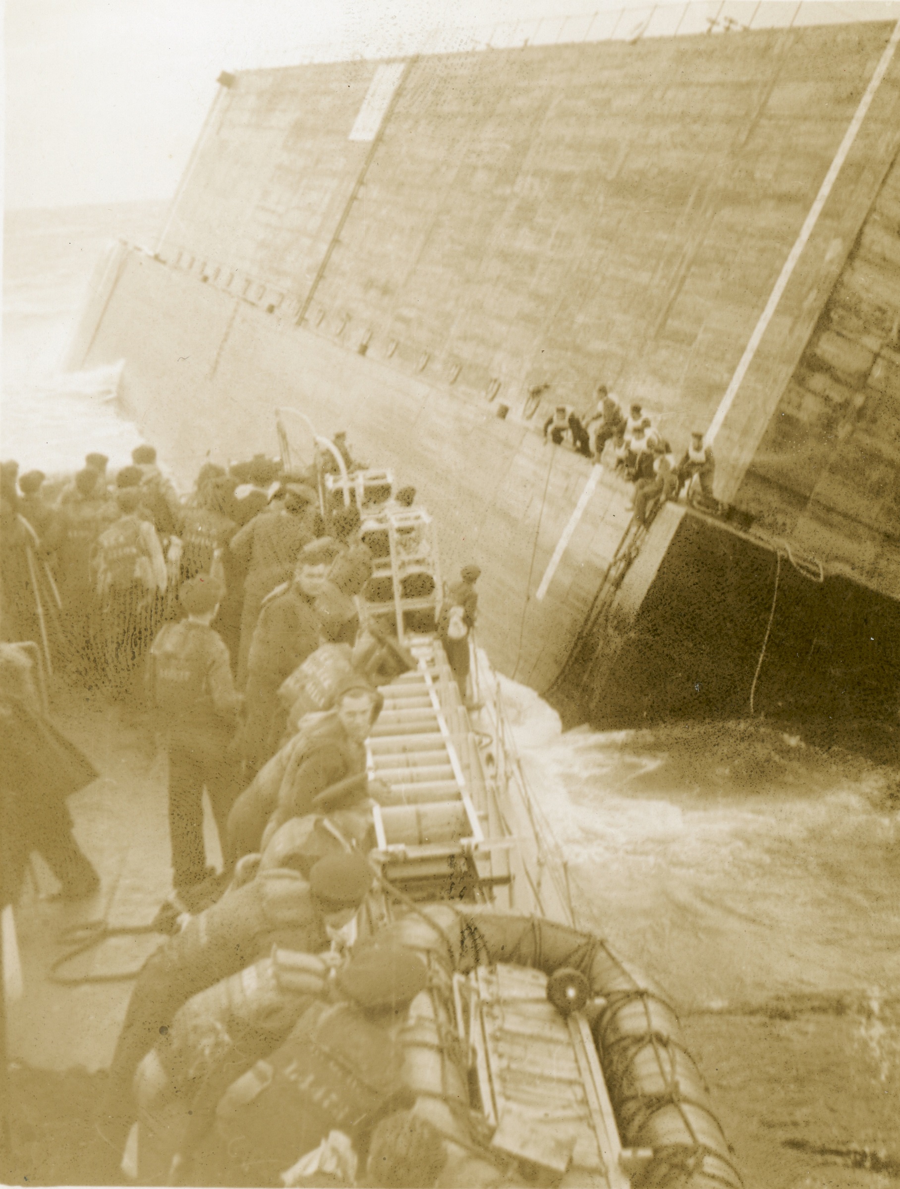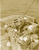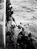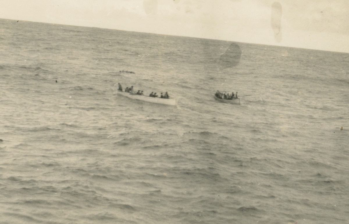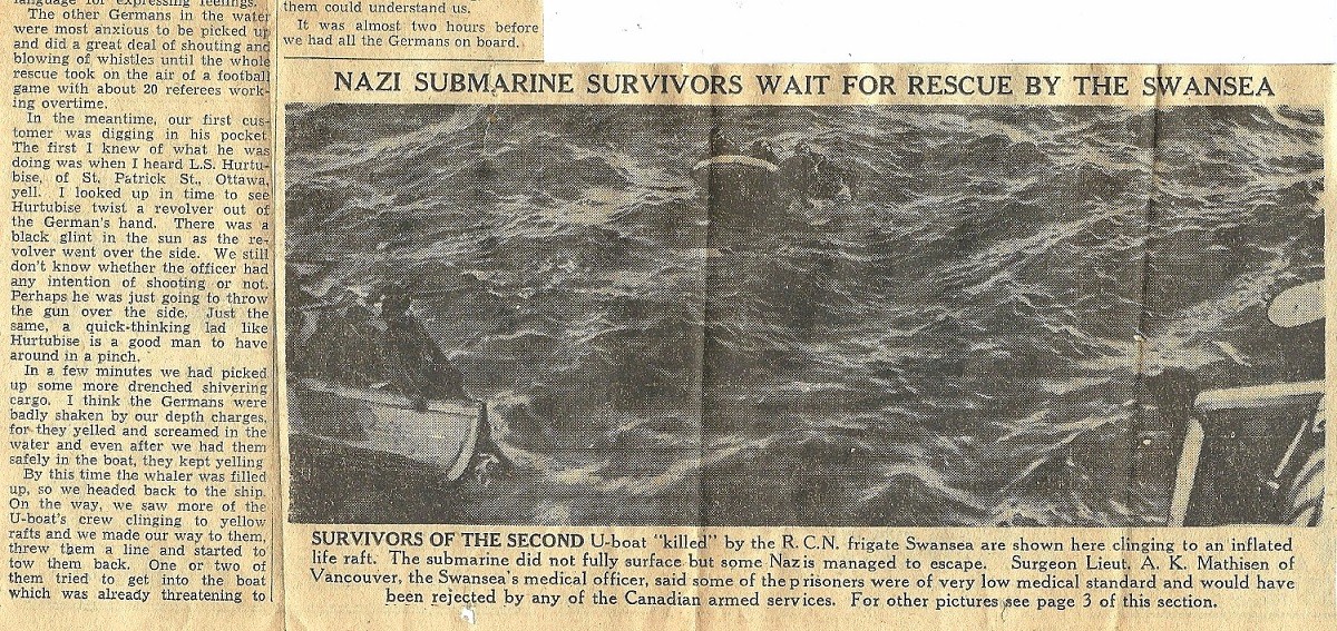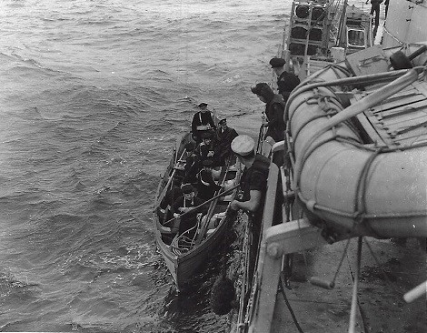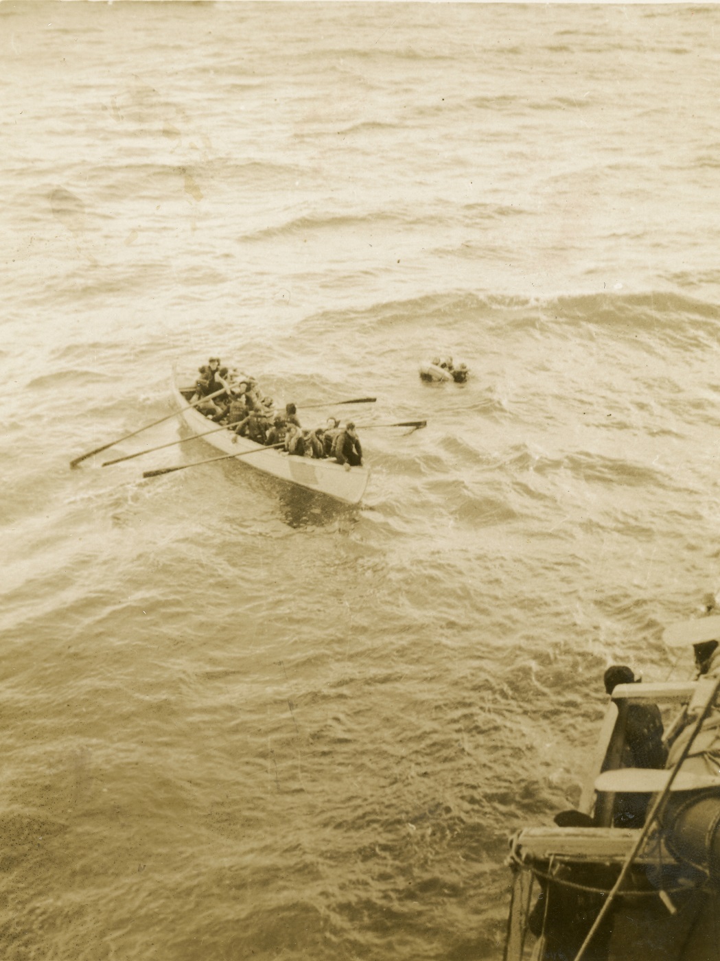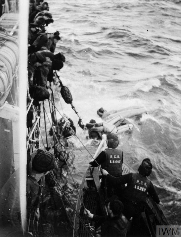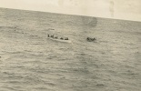 U-boat (2 & 3) U-boat survivors on float by HMCS SWANSEA's sea boat (4) U-boat survivors being