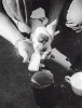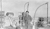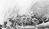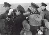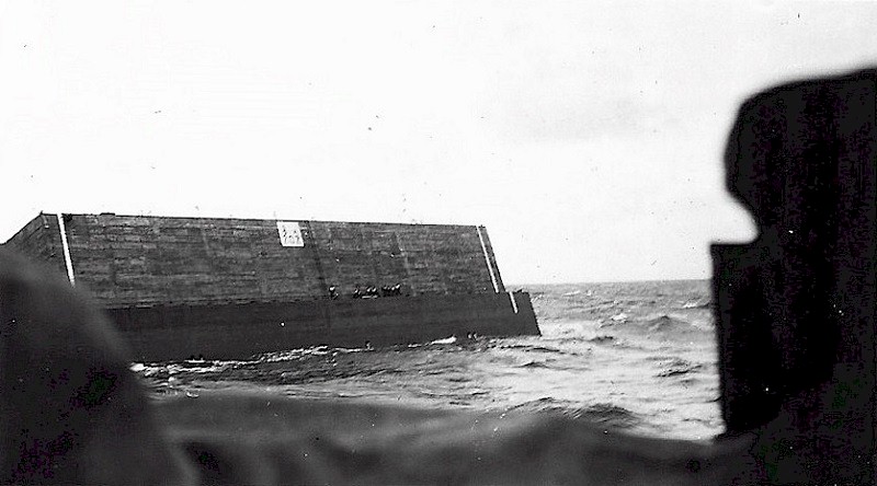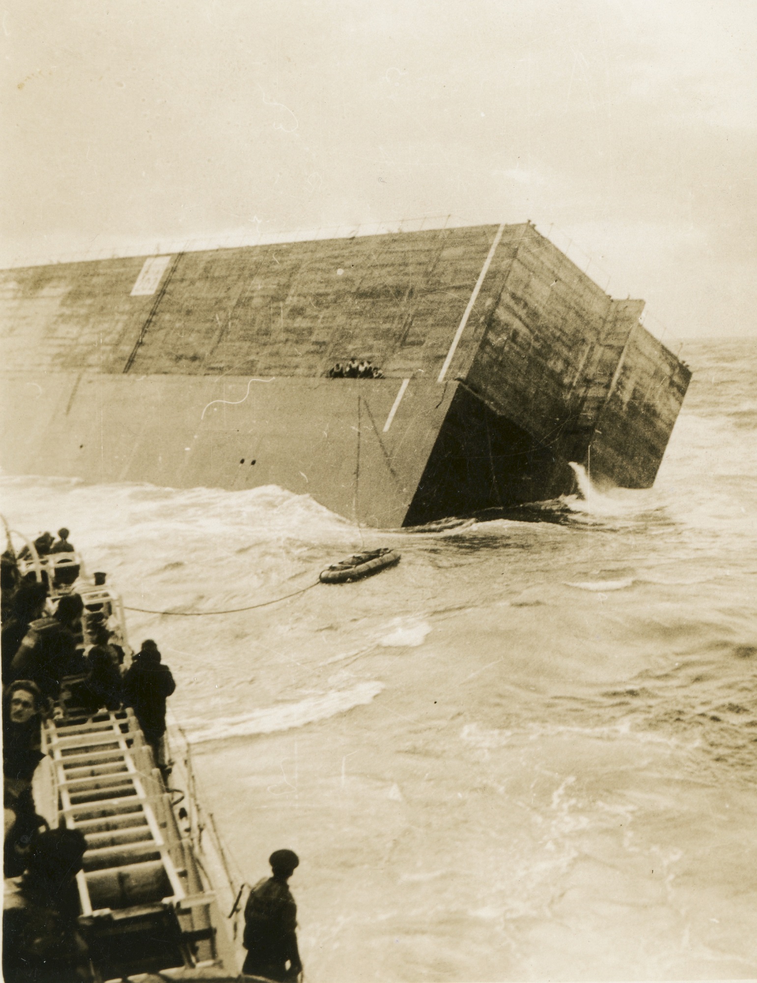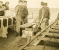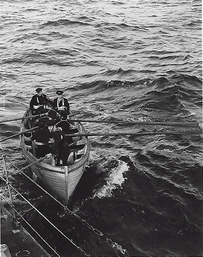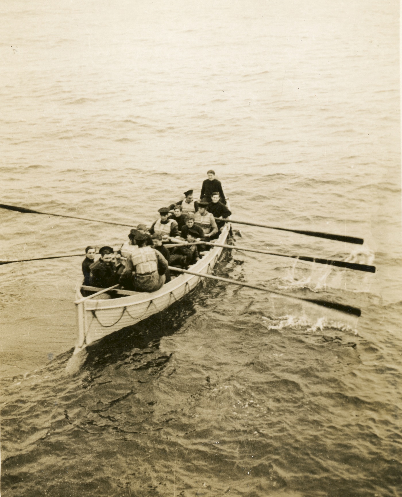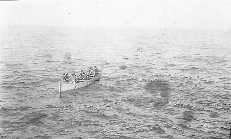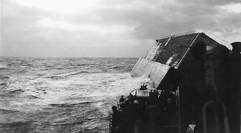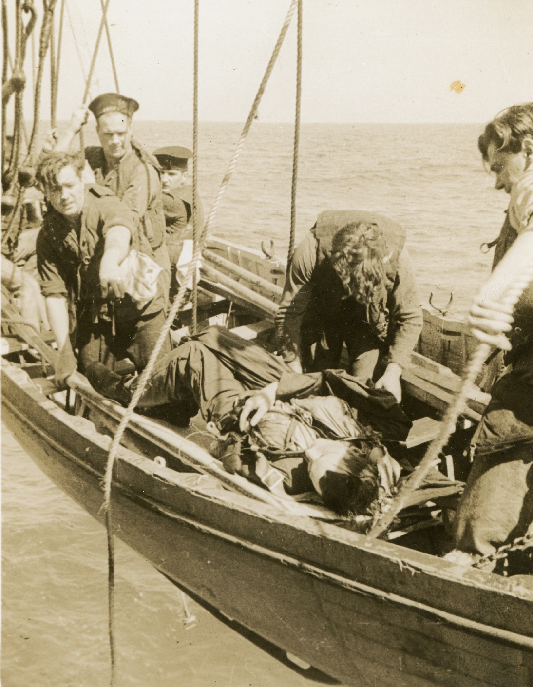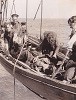 U-boat (2 & 3) U-boat survivors on float by HMCS SWANSEA's sea boat (4) U-boat survivors being