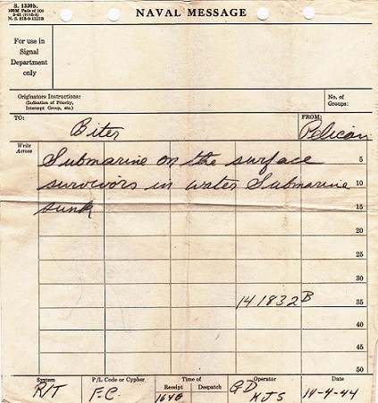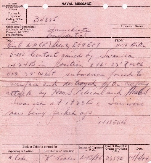 process in company with HMS PELICAN, the victim this time being U-448. Eight days later, on 22 April 1944, this time with