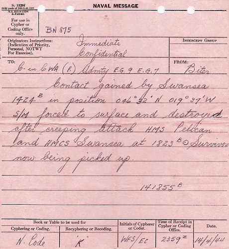 and HMS PELICAN in position 46-22 N, 19-35 W. HMCS SWANSEA (K328) gained sonar contact, while screening for the escort Carrier
