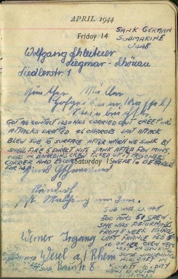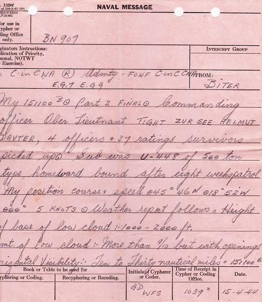 U-448 (Oblt Helmet Dauter) a type VIIC U-boat, sunk on 14 Apr 1944 by HMCS