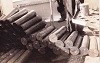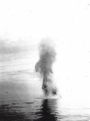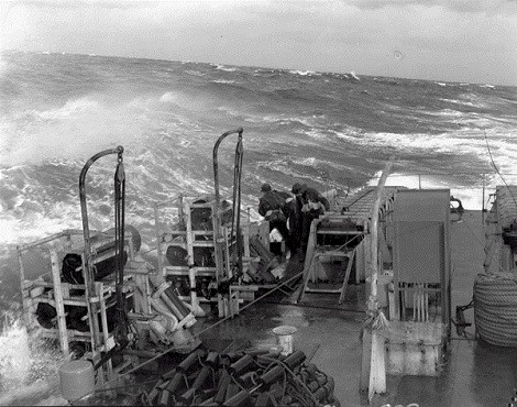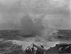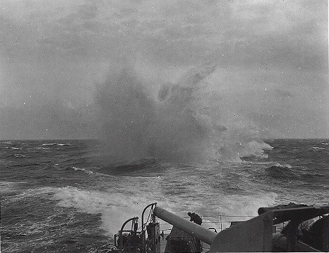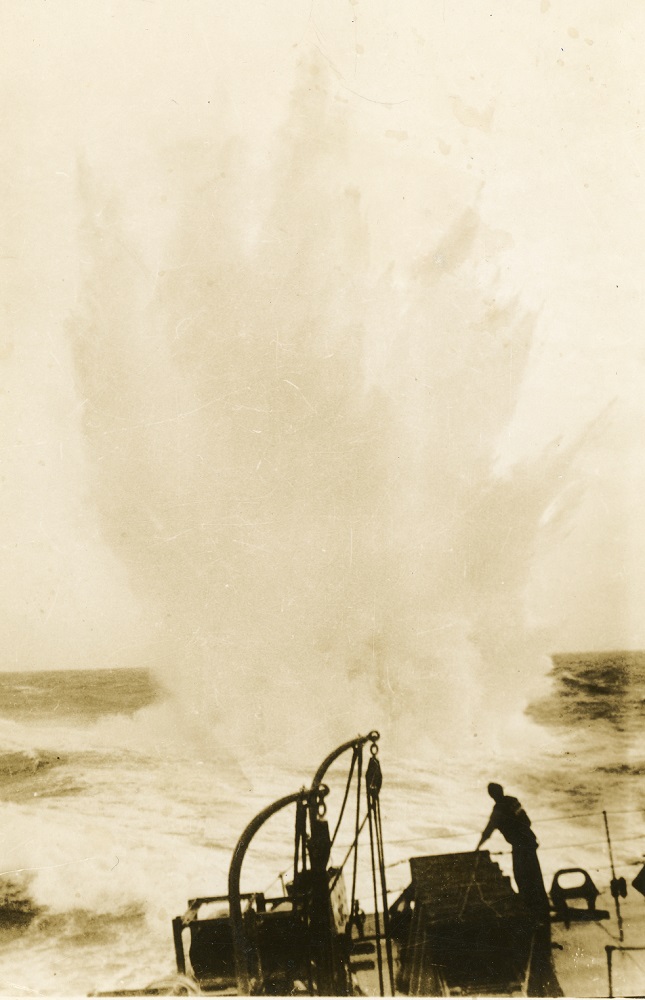 Depth charge explodes astern of HMCS SWANSEA. Sailor by rack ready to release another