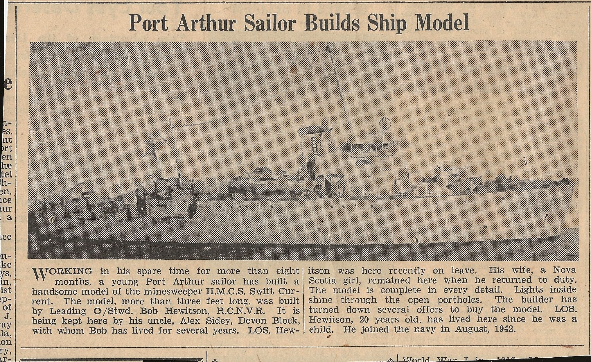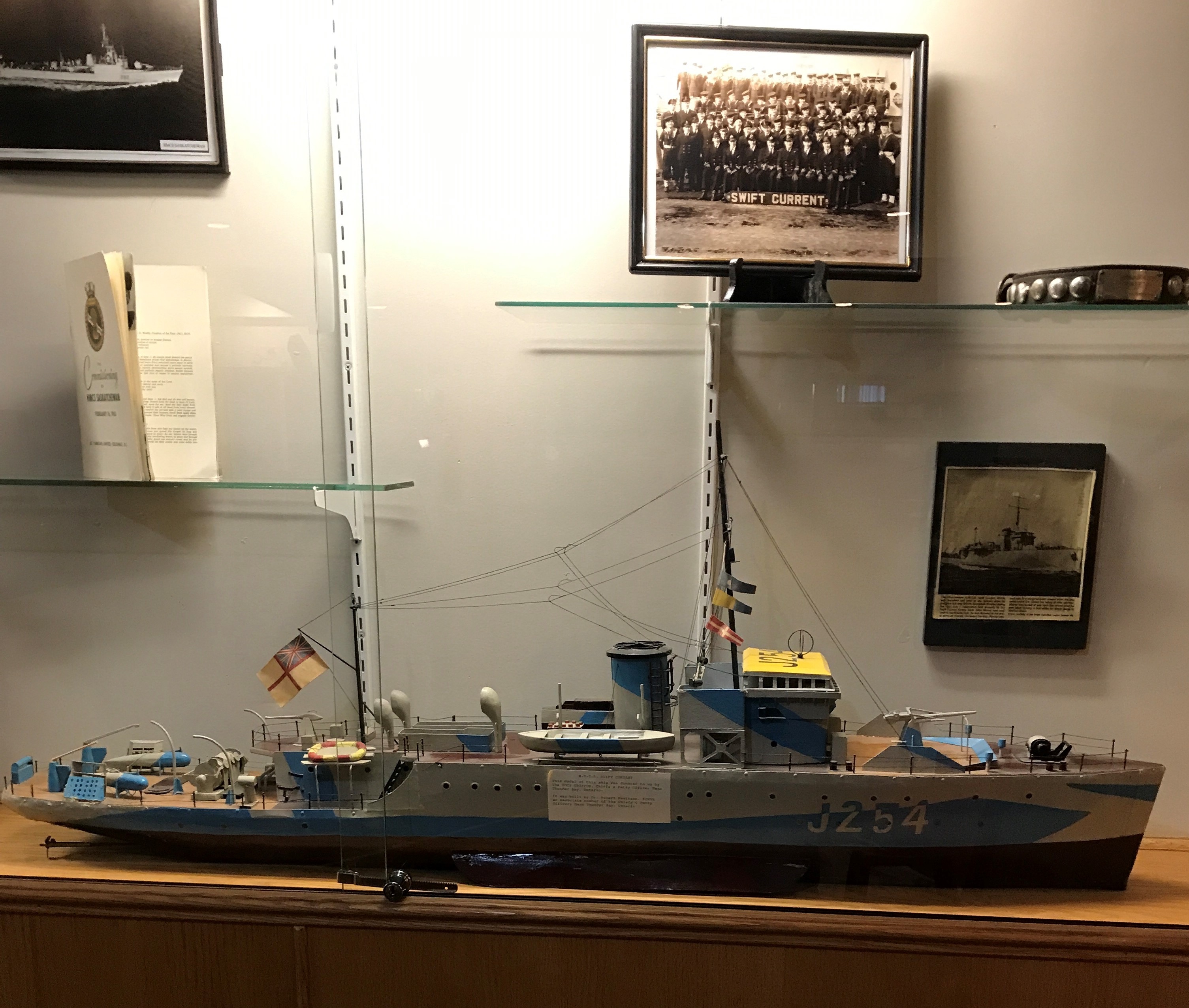 Article on the model of HMCS SWIFT CURRENT, built by L/Stwd Bob Hewitson, RCNVR The model is on display at RCL Br #56, Swift Current, SK Courtesy of Sharon Fortney, Branch Secretary, RCL BR #56, Swift Current, SK