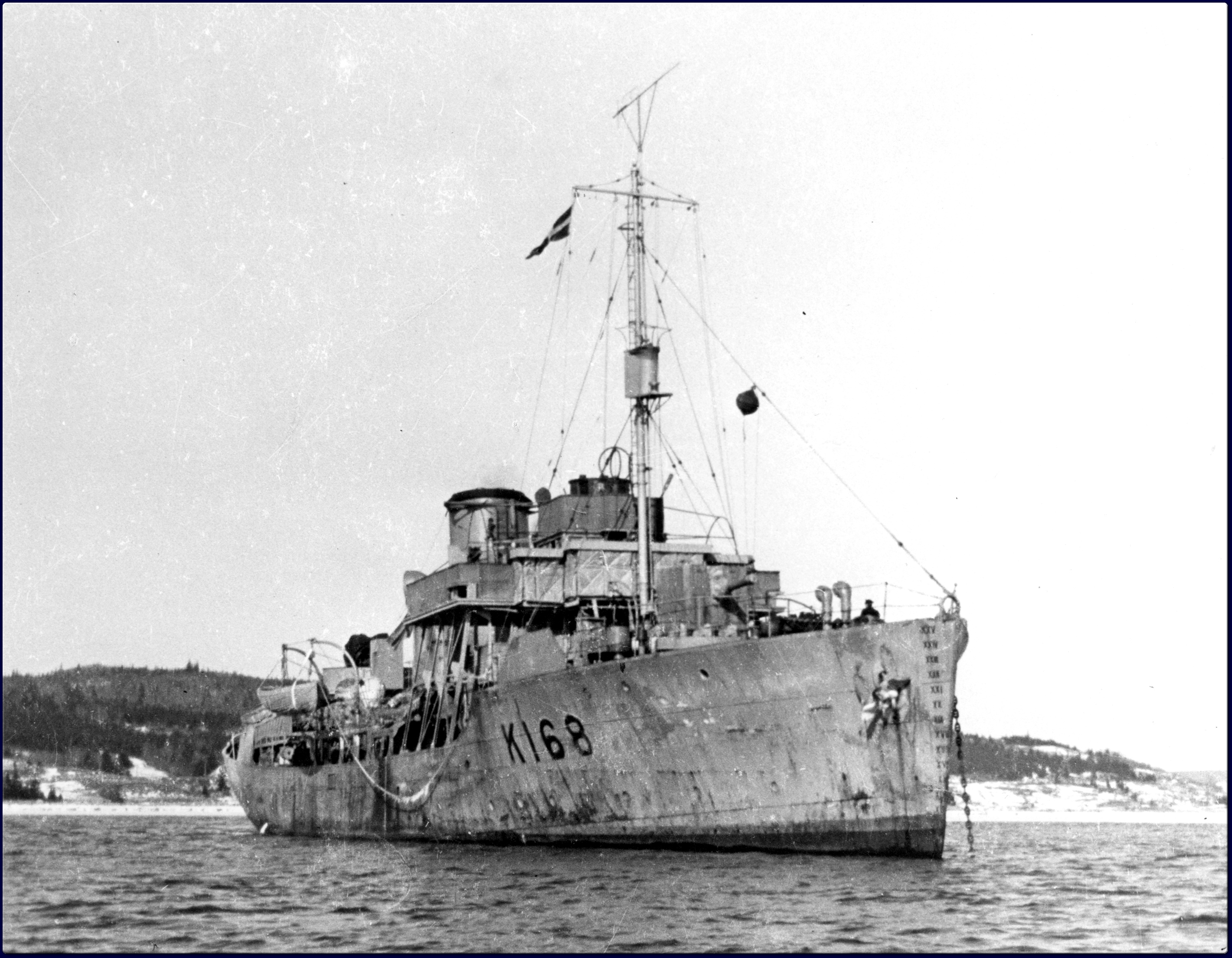(TPA001) HMCS THE PAS K168 - "My father CL Mofford, was the Commanding Officer of the above Canadian Corvette near the end of WWII. He assisted a British Destroyer in sinking the German U-Boat U-106 in the English Channel in 1944." // Photo courtesy of Glen Mofford (TPA002) HMCS THE PAS K168 in St. Margaret's Bay, Nova Scotia, 11 Nov 1942 // Source: Flickr photo collection of Ron Bell (TPA003) HMCS THE PAS K168 // From the collection of William McLean // Courtesy of Derwyn Crozier-Smith (TPA004) HMCS THE PAS K168 // Courtesy of the CFB Esquimalt Naval and Military Museum (TPA005) Looking astern from HMCS THE PAS with convoy visible to the right side of the photo and a smoke marker in the ocean to the left // From the collection of George Mason, RCNVR // Courtesy of Kelly Mason