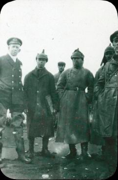 (TPV004) HMCS THIEPVAL in Nazan Bay, Atka Island, in the Aleutians // Nazan Bay was one of HMCS THIEPVAL'S last stops before the diminutive trawler crossed the north Pacific on the way to the Soviet Union and Japan. This hand-coloured photograph gives an idea of the barren shores THIEPVAL would visit during this 1924 journey. A secret component of the mission involved examining Alaskan and northern Japanese ports to determine whether the United States or Japan was contravening the 1922 Washington Naval Treaty by fortifying these areas. Reports by THIEPVAL'S commander, W.R.J. Beech, detailed resources, the presence of military or government officials, and the state of communications in several northern ports. // Source: George Metcalf Archival Collection // CWM 19710050-001_16 // Courtesy of the Canadian War Museum (TPV005) HMCS THIEPVAL'S 12-Pounder Cannon // Members of THIEPVAL'S crew maintain the ship's main armament, a 12-pounder cannon mounted on a platform in the bow. THIEPVAL'S limited weaponry was sufficient for the ship's peacetime patrol work. After being transferred to the west coast from Halifax in 1919, THIEPVAL'S duties included counting seals, patrolling against rum-runners, and ensuring that American fishing boats did not enter Canadian territorial waters. Years after THIEPVAL'S 1930 sinking, divers raised this gun and placed it on display at nearby Ucluelet, British Columbia. // Source: George Metcalf Archival Collection // CWM 19710050-001_86 // Courtesy of the Canadian War Museum (TPV006) Bruno with an unknown officer on HMCS THIEPVAL // In 1924, one of the few ships in the post-First World War Royal Canadian Navy, the Battle-class trawler HMCS THIEPVAL, became the first Canadian warship to visit the Soviet Union and Japan when it provided support for a British attempt to fly around the world. While in Hakodate, Japan, HMCS THIEPVAL'S crew adopted the small brown bear seen here and named him Bruno. Also known as "Haca-Daddy" (a play on "Hakodate"), Bruno shows up in a number of other photographs taken during THIEPVAL'S trip. Brought back to Canada, Bruno spent years living at HMCS NADEN, the Royal Canadian Navy's base at Esquimalt. Bruno subsequently developed a dependency on alcohol. Sadly, he came to a tragic end when he died of poisoning after ingesting dockyard supplies. // George Metcalf Archival Collection // Courtesy of the Canadian War Museum (TPV007) Soviet Soldiers and HMCS THIEPVAL Lieutenant // A group of Red Army soldiers and other onlooker's clusters beside one of HMCS THIEPVAL'S lieutenants // George Metcalf Archival Collection // Courtesy of the Canadian War Museum (TVP008) The RAF flying boat seen here involved in an ambitious round-the-world flight attempt // The British round-the-world flight attempt ended on this beach near Nikolskoye on Bering Island, off the Kamchatka Peninsula. // Soon after leaving Petropavlovsk, the Vickers Vulture flying boat made a forced landing in the ocean. The crew were able to get their aircraft to the nearest beach, but the damage seen here could not be repaired. HMCS THIEPVAL raced through the night to meet the stranded crew and then salvaged their aircraft, hauling it up on the ship's rear deck for the trip to Canada. The propeller from this aircraft was subsequently displayed in the naval officers' mess at Esquimalt. // George Metcalf Archival Collection // Courtesy of the Canadian War Museum