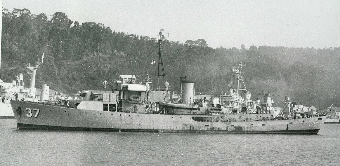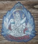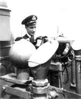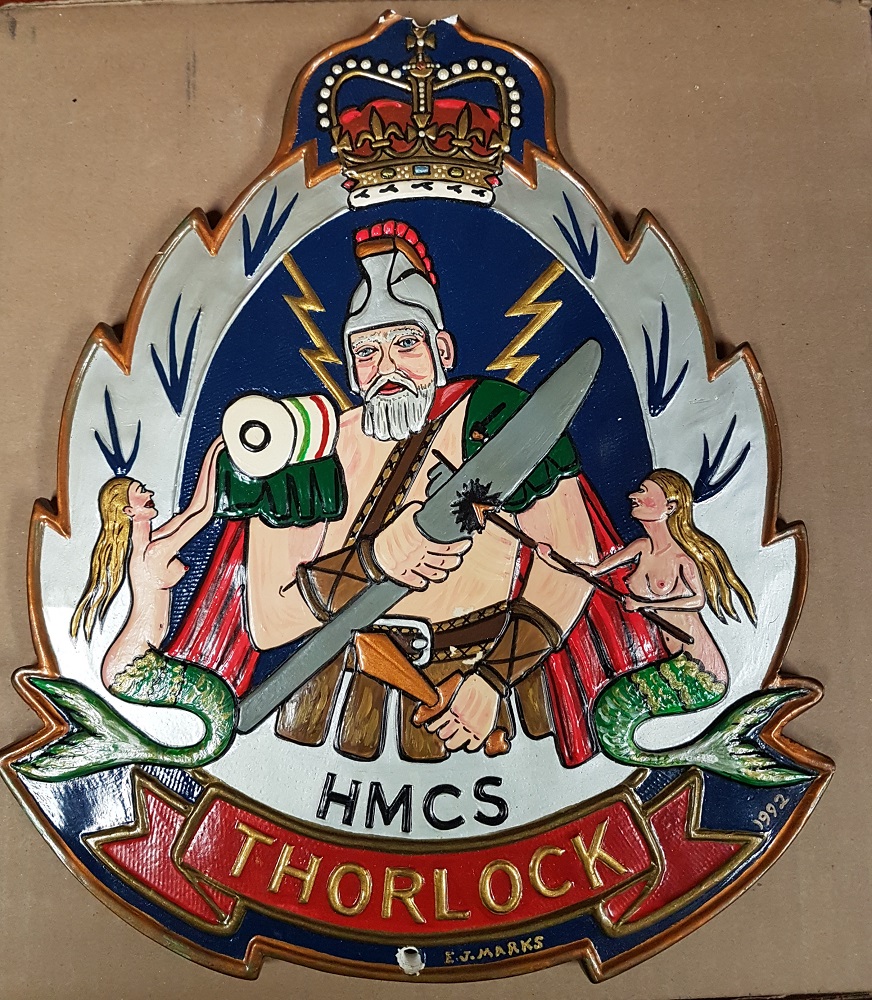 (THL001)Plaster cast of HMCS THORLOCK's badge // Photographer: Glenn Kempson - Courtesy of Chad Green // It is believed the badge is based on gunshield art for HMCS THORLOCK, but to date no photographic proof has been found (THL002) SLt John Economides on the bridge of HMCS THORLOCK K394 // From the collection of John Economides, Lt, RCNVR // Courtesy of Peter Economides (THL003) Chilean Navy Ship Papudo former HMCS THORLOCK // Source: base.mforos.com