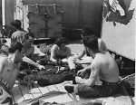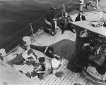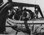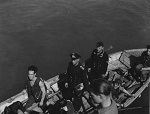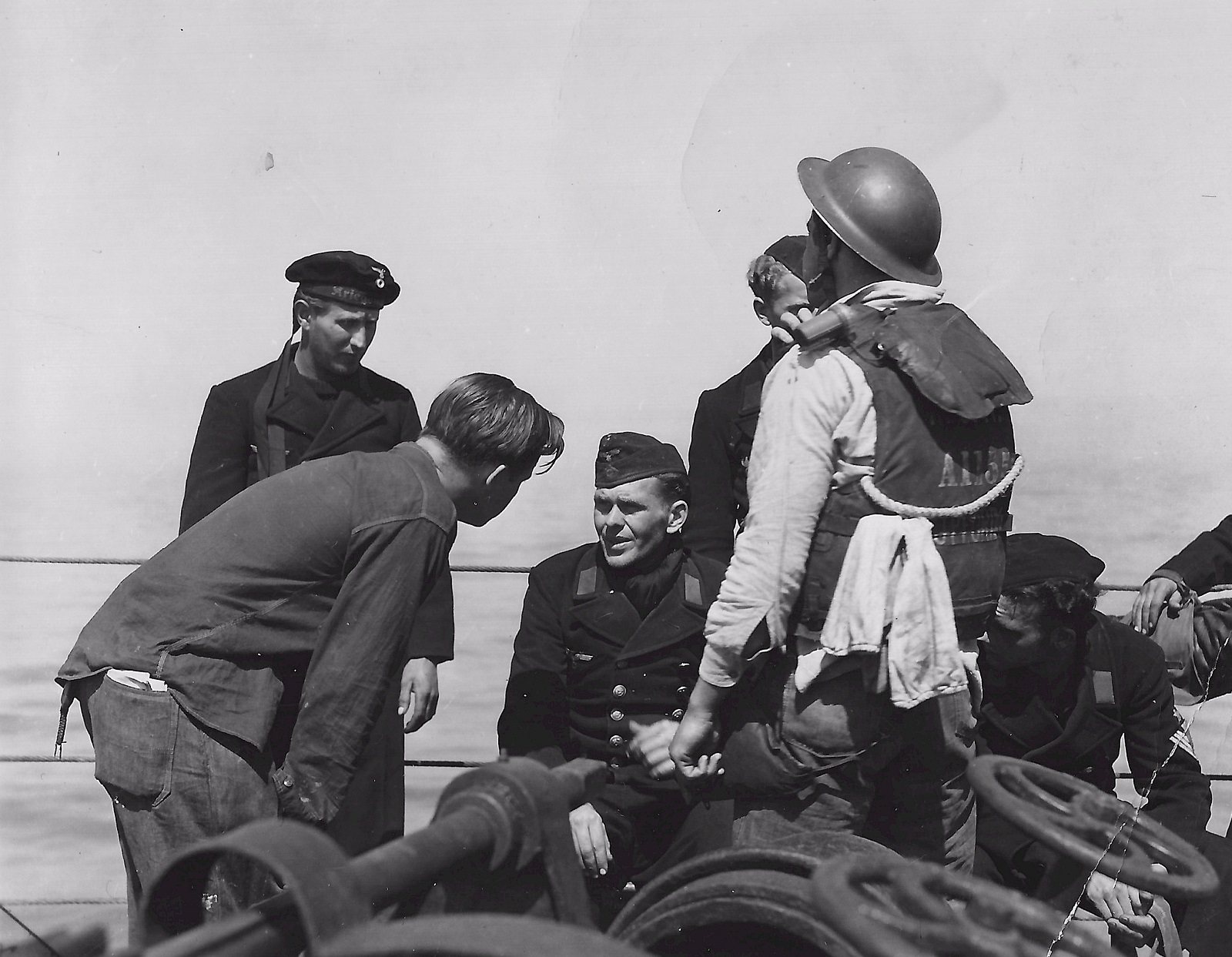 (DN115) THUNDER crewmember speaks with German sailor while another crew member stands guard (DN116) German prisoners on the foc's'le of HMCS THUNDER (DN117-DN118) Sailors on HMCS THUNDER relaxing on the upper decks