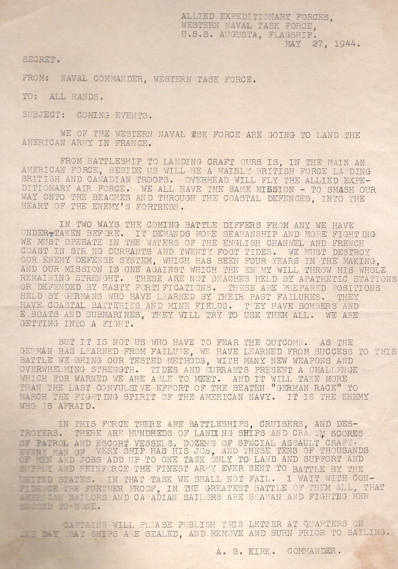 (1) Pre-D-Day message from Naval Commander Western Task Force (flagship USS Augusta)