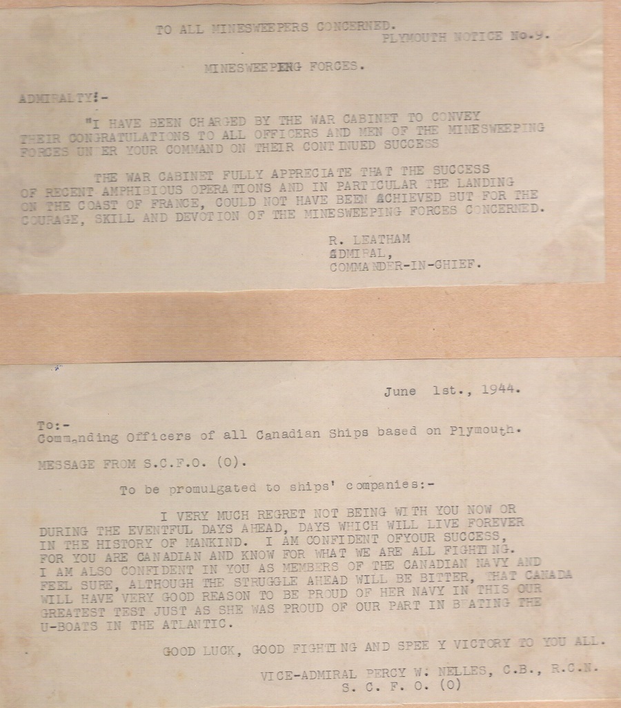 (2) Post D-Day message from Admiralty congratulating Minesweeping forces and Pre D-Day message (01 Jun 1944) from S.C.F.O. (Vice-Admiral Percy W. Nelles) to all Canadian Ships, Plymouth