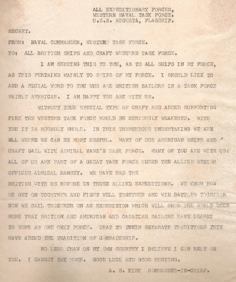 (3) Pre D-Day message from Naval Commander Western Task Force (flagship USS Augusta) to all British ships and craft in Western Task Force