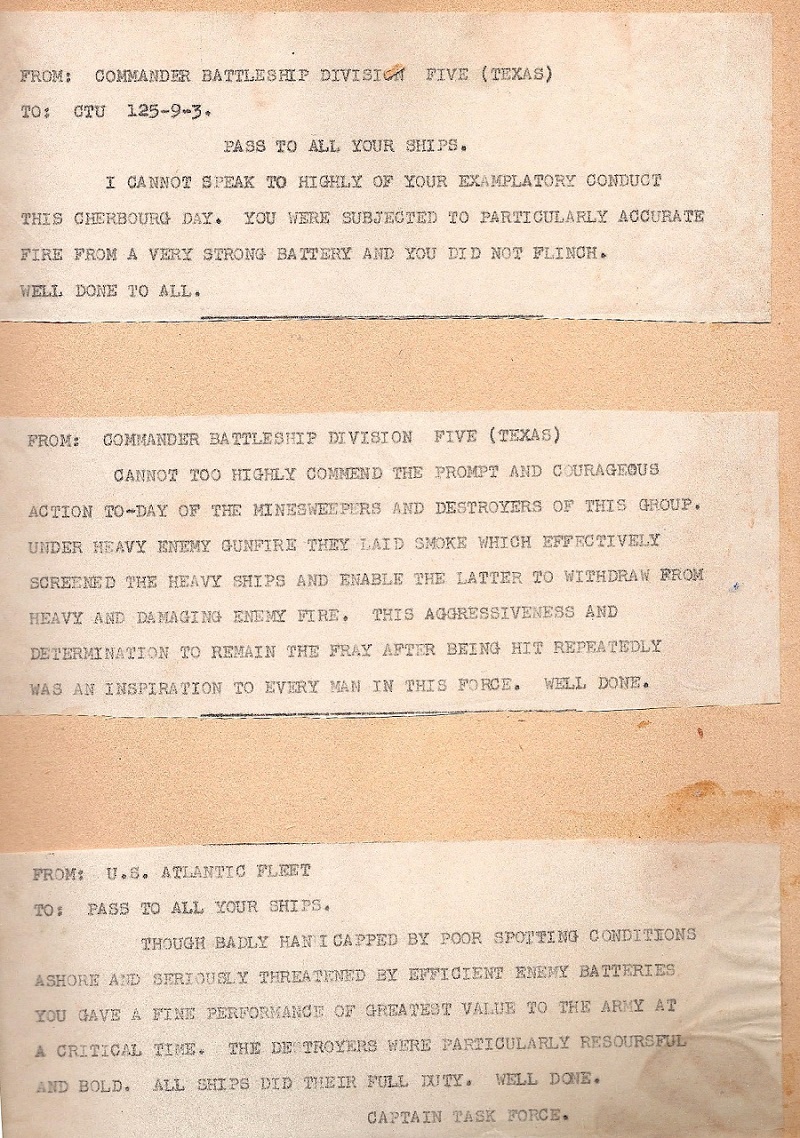 (4) Post D-Day message from Commander Battleship Division Five (USS) Texas and Commander Task Force (US Atlantic Fleet) congratulating all ships involved.