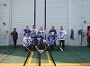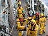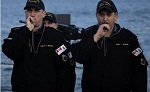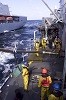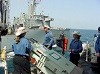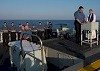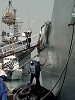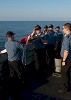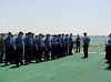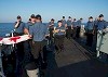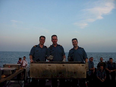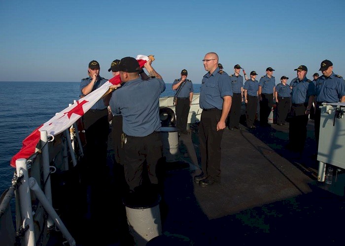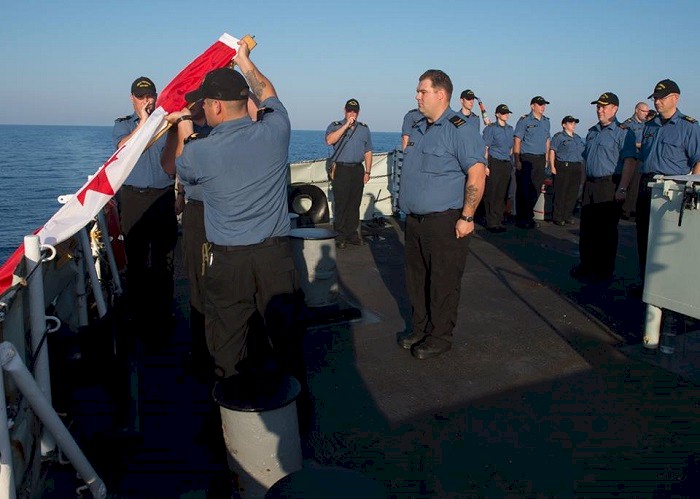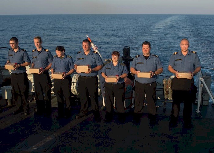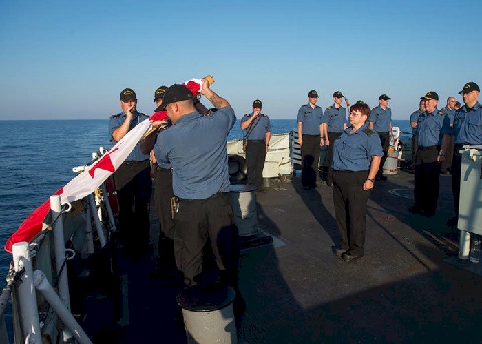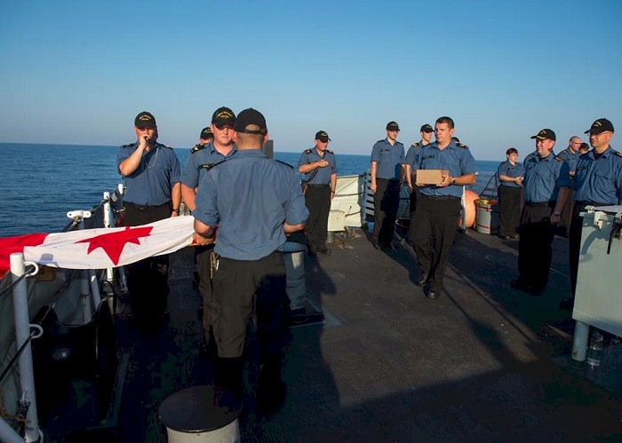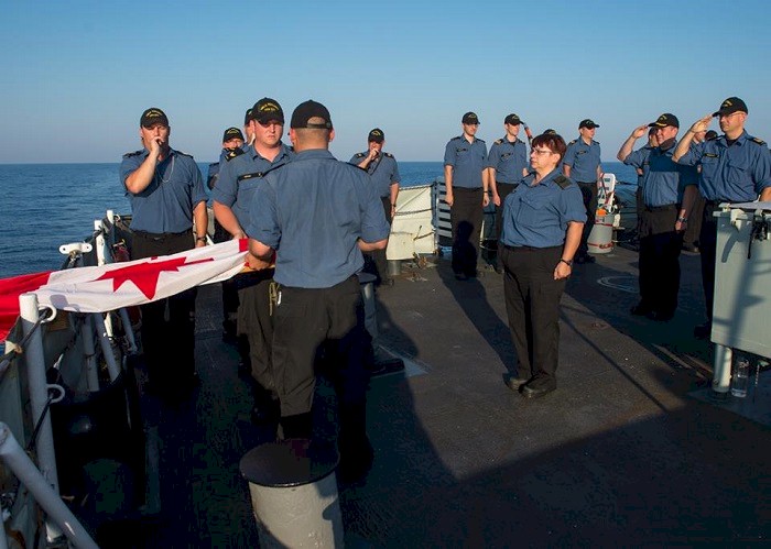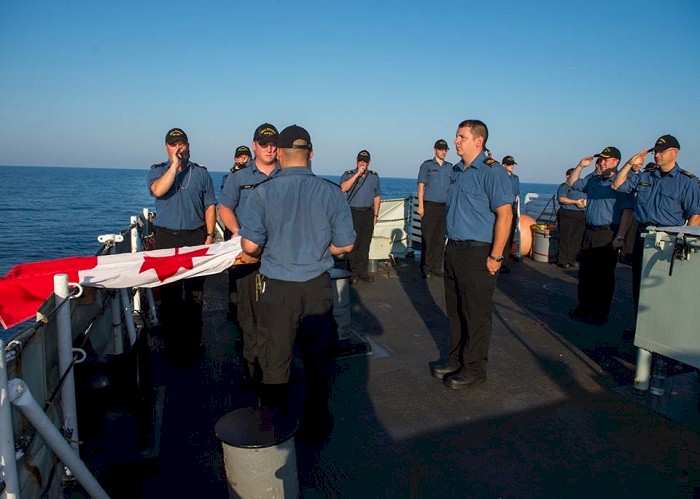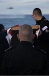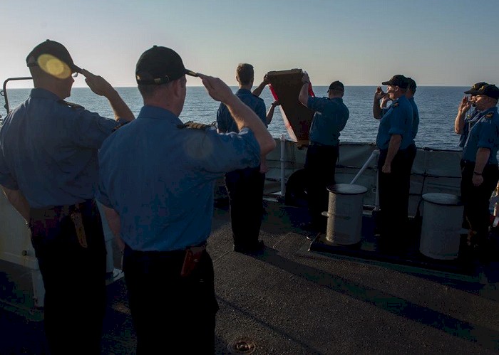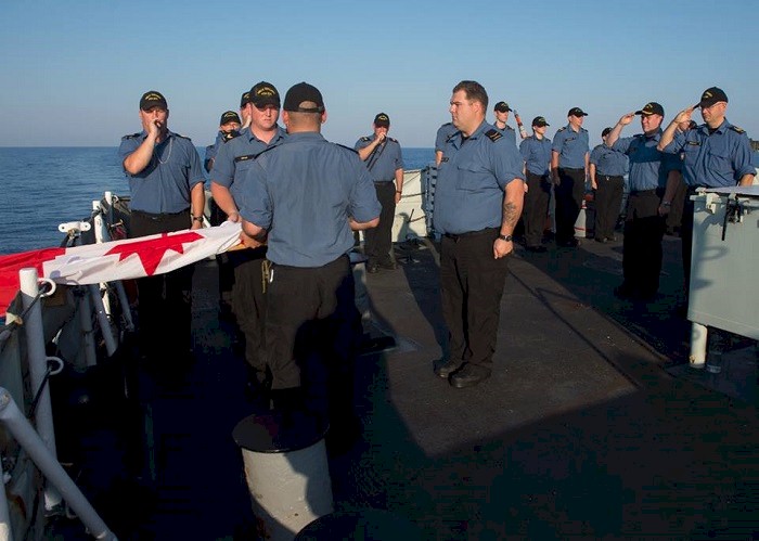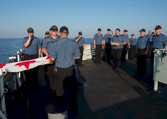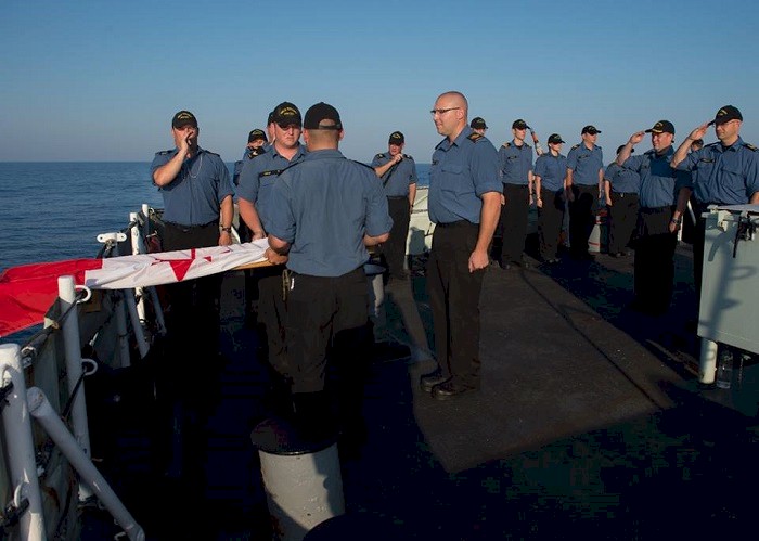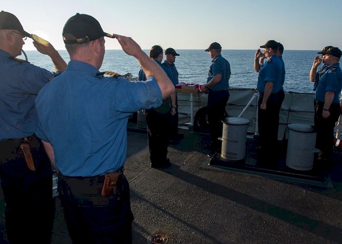 crew of HMCS Toronto salutes as the ashes of AB Robert Louis Kelly