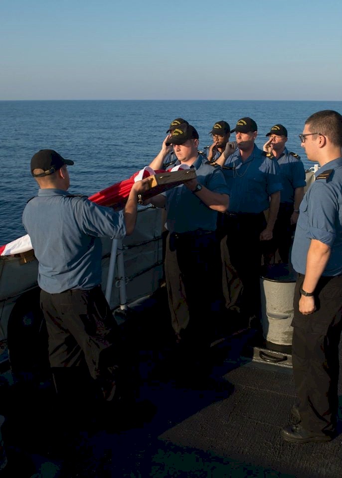 Petty Officer 2nd Class Herbert Frederick Era King is committed to the sea from the quarter deck