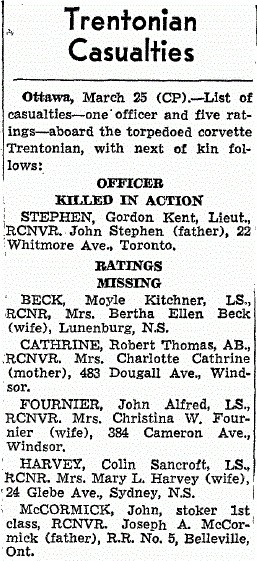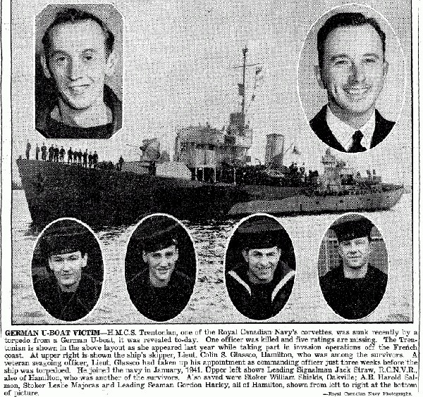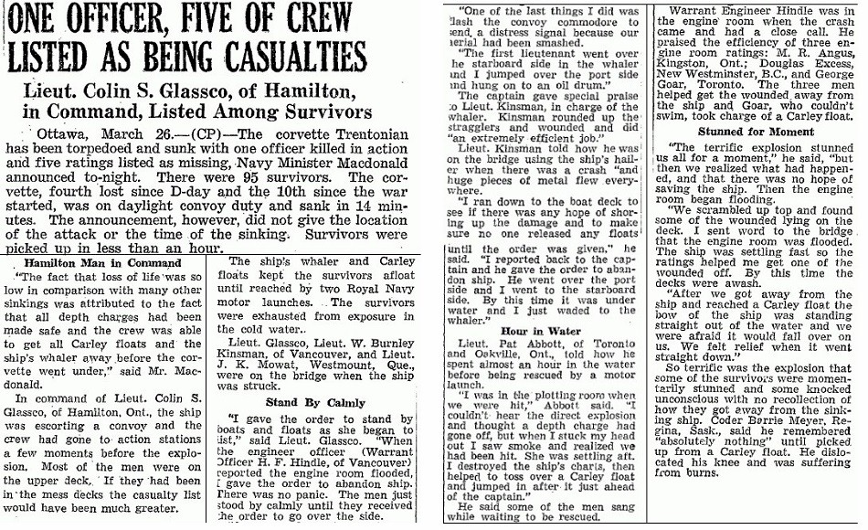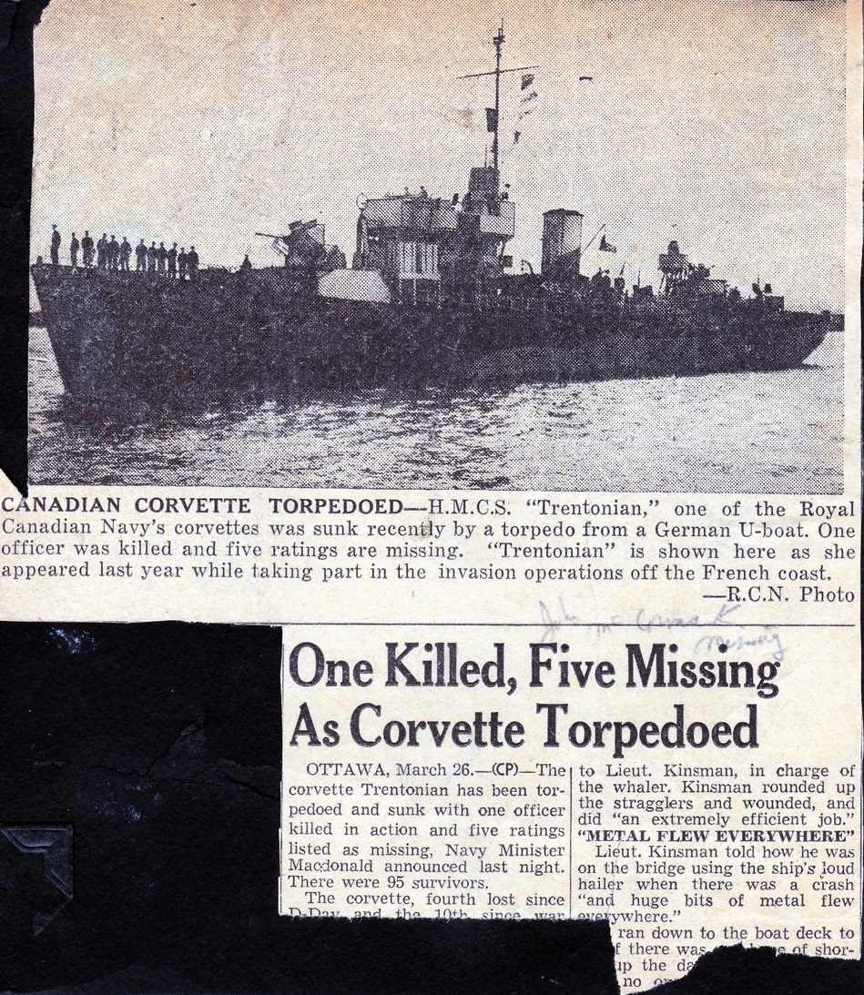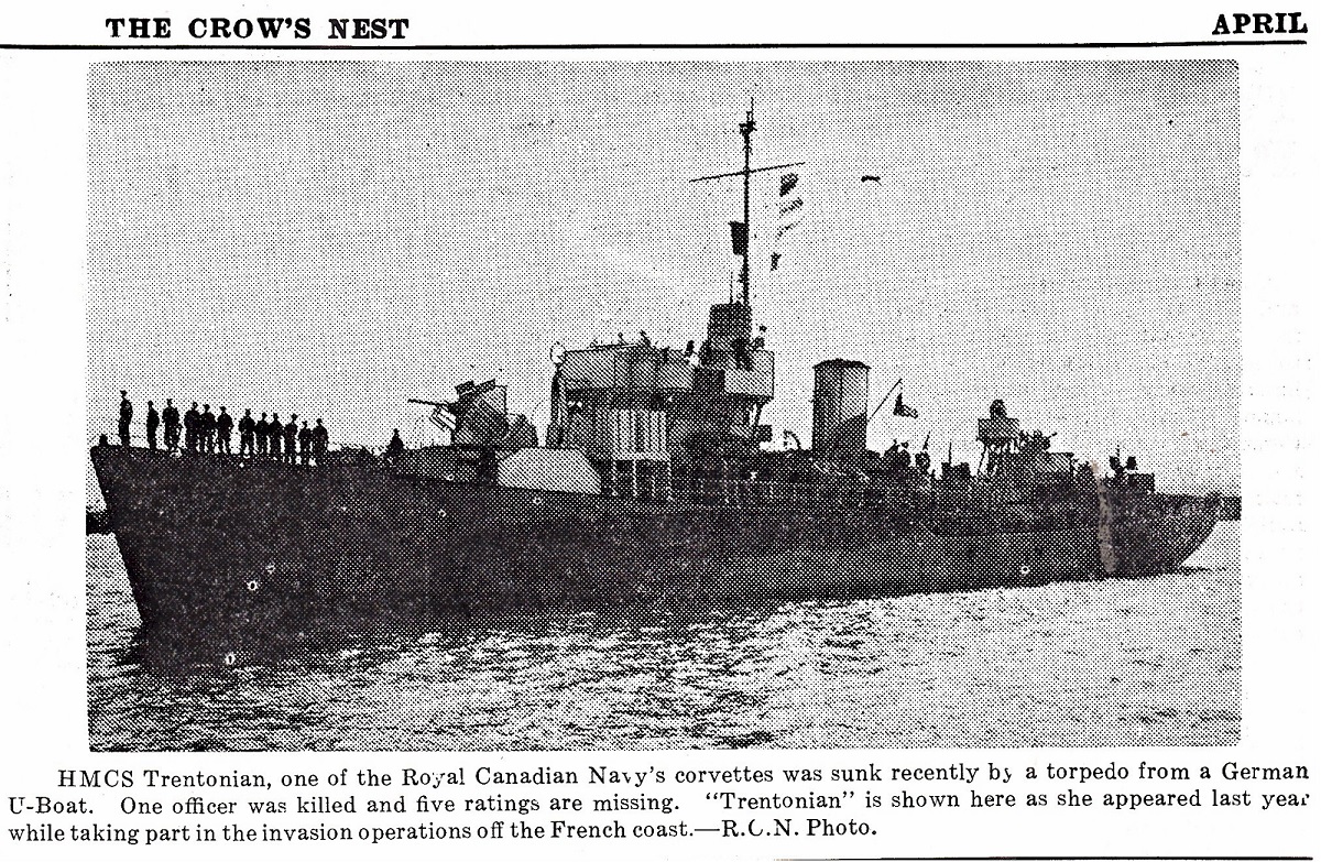 Article on the sinking of HMCS TRENTONIAN. Crew listed in the