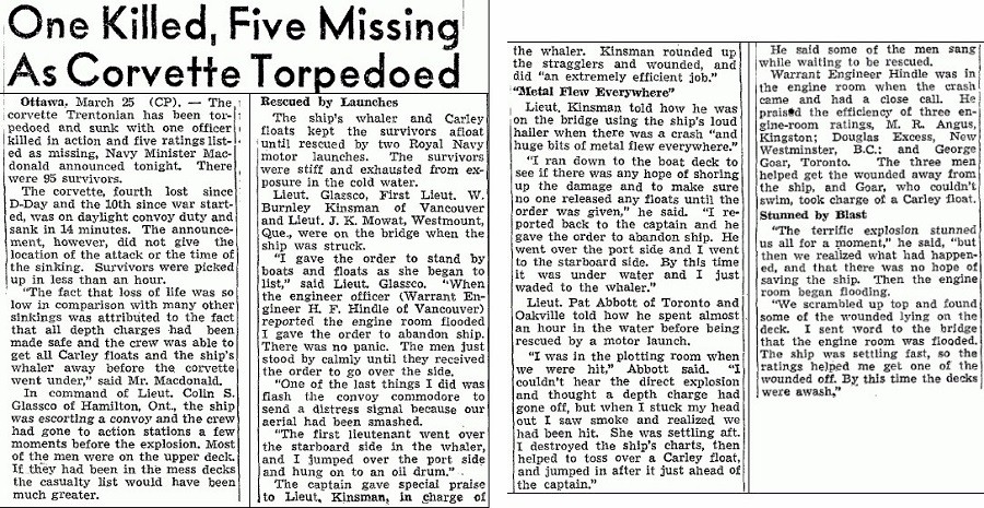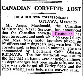 Article on the torpedoing of HMCS TRENTONIAN K368
