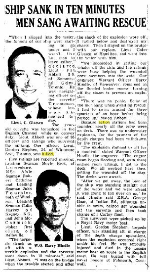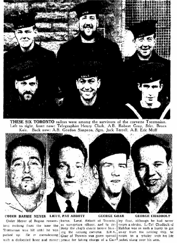 Newspaper article on 10 survivors from HMCS TRENTONIAN