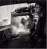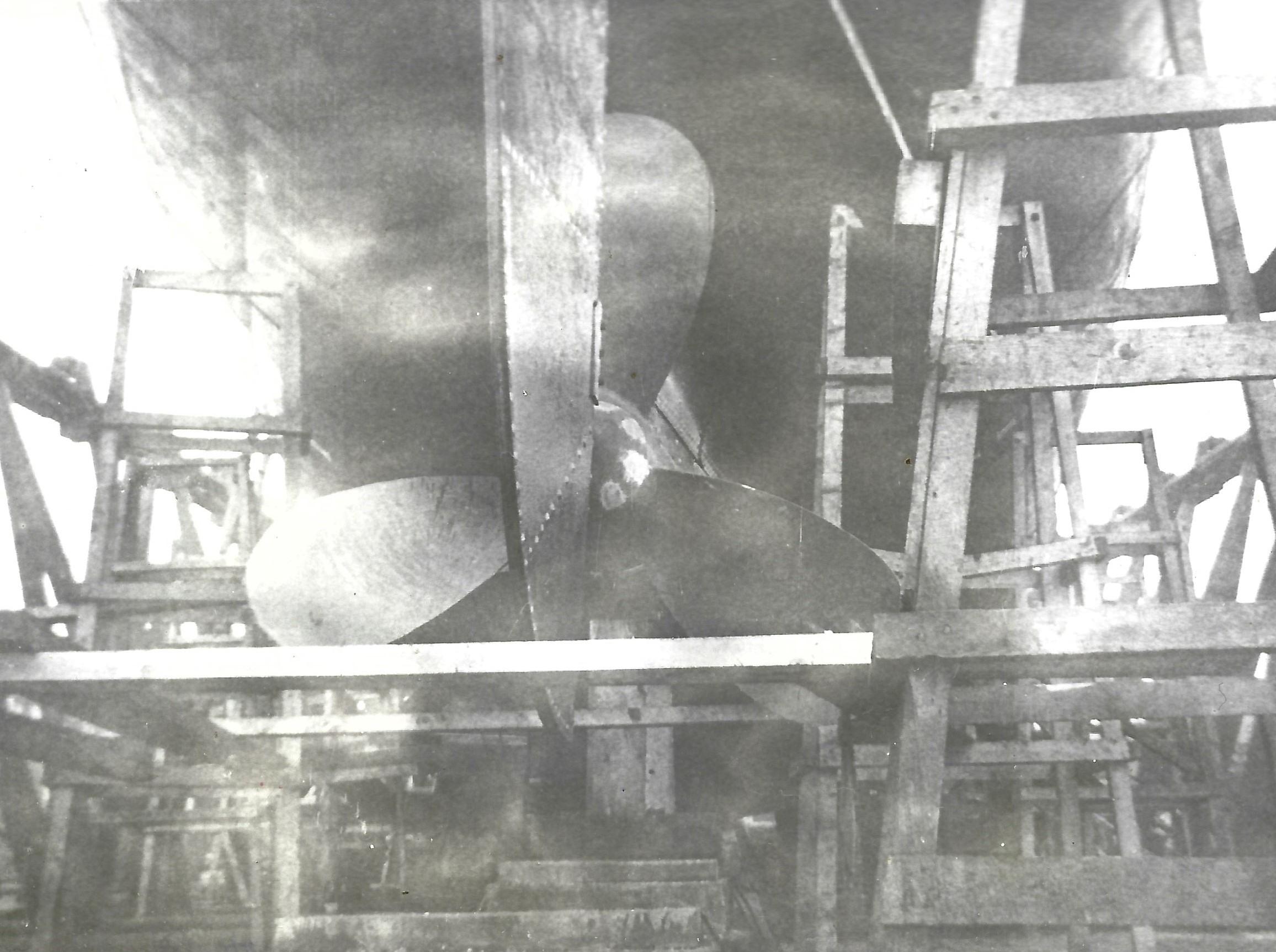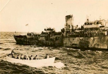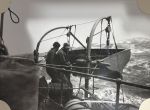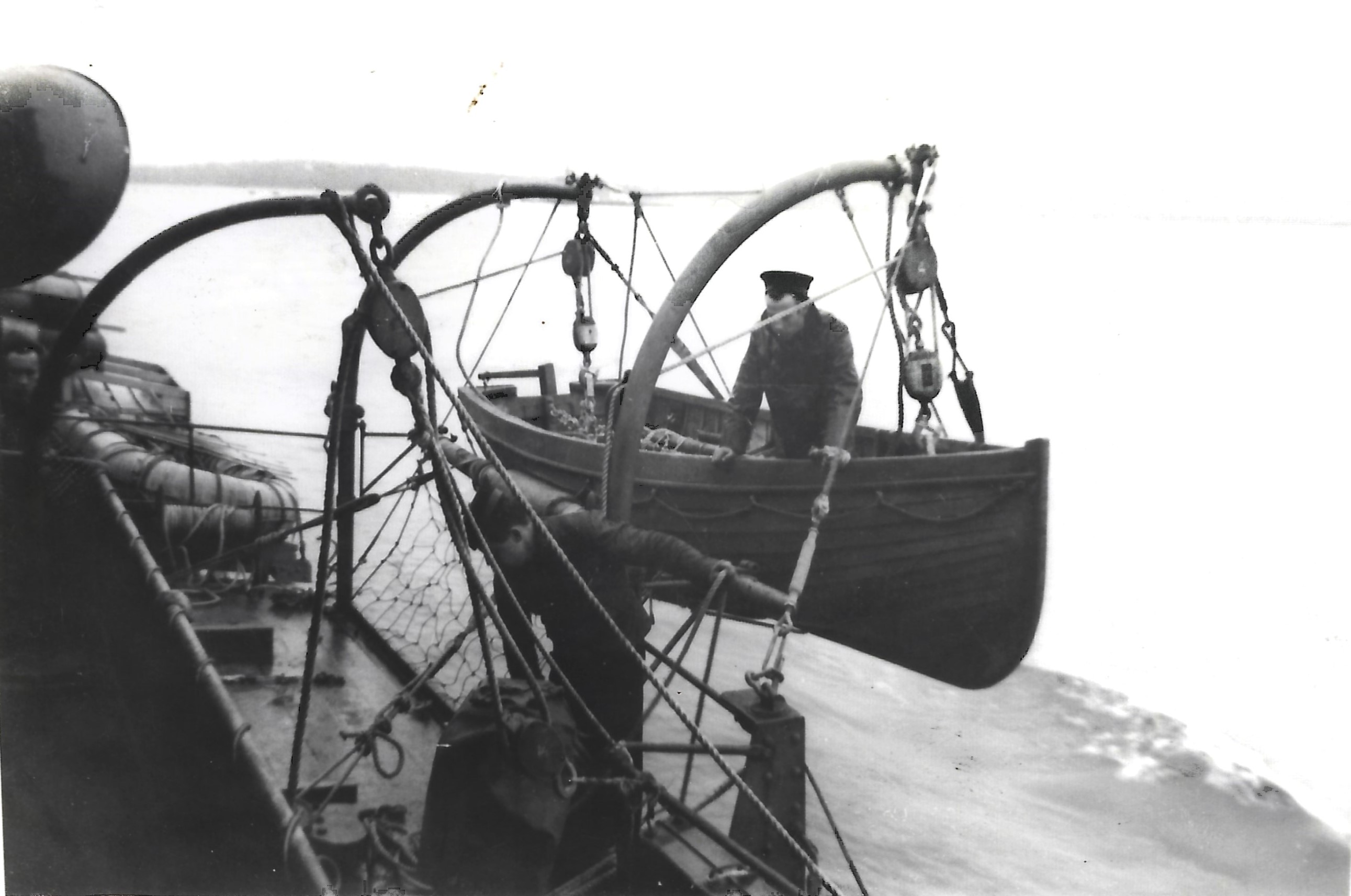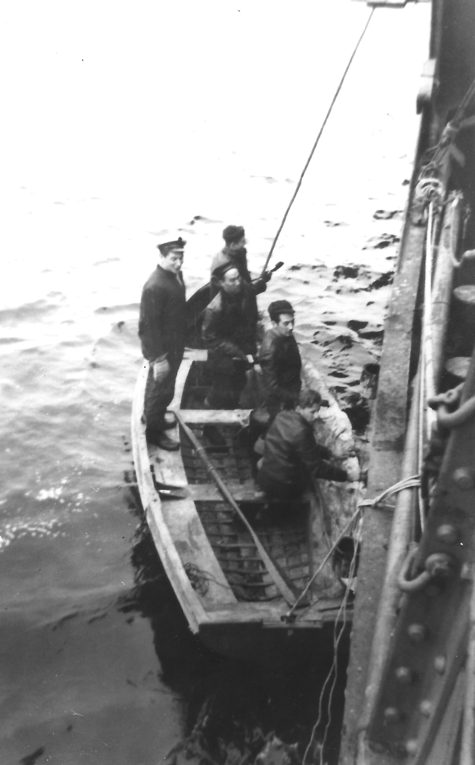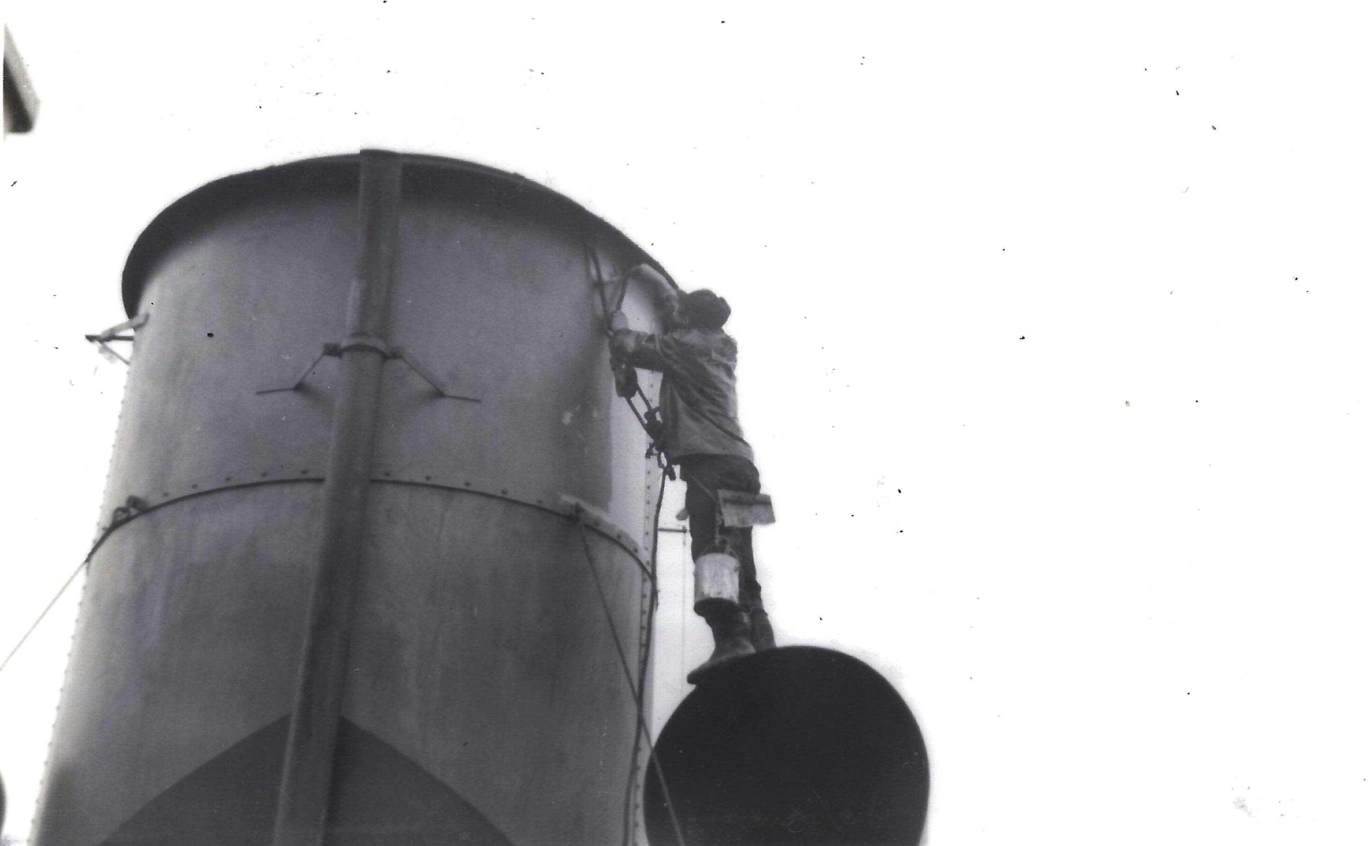 (TB45) Unknown sailor on the boat deck, between the funnel and the boiler room hatch, on HMCS TRILLIUM K172 (TB46) Unknown sailor painting the funnel on HMCS TRILLIUM K172 (TB47) Unknown sailors painting the ship's side from HMCS TRILLIUM'S boat (TB48) With the shoreline in the distance, the ship's boat is being inspected after being turned out and readied for use as HMCS TRILLIUM K172 heads out to sea