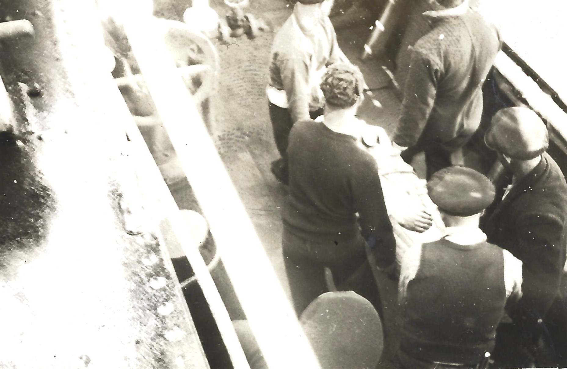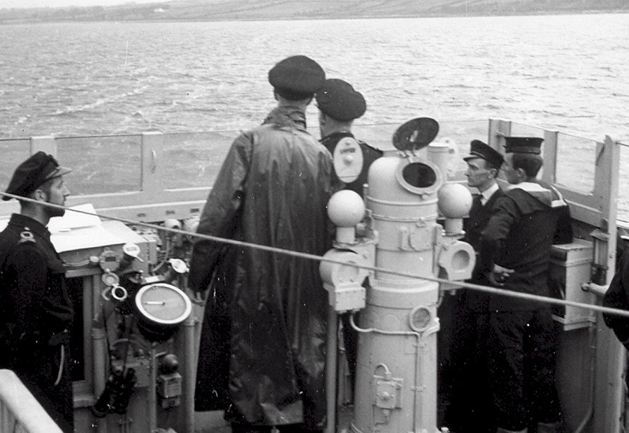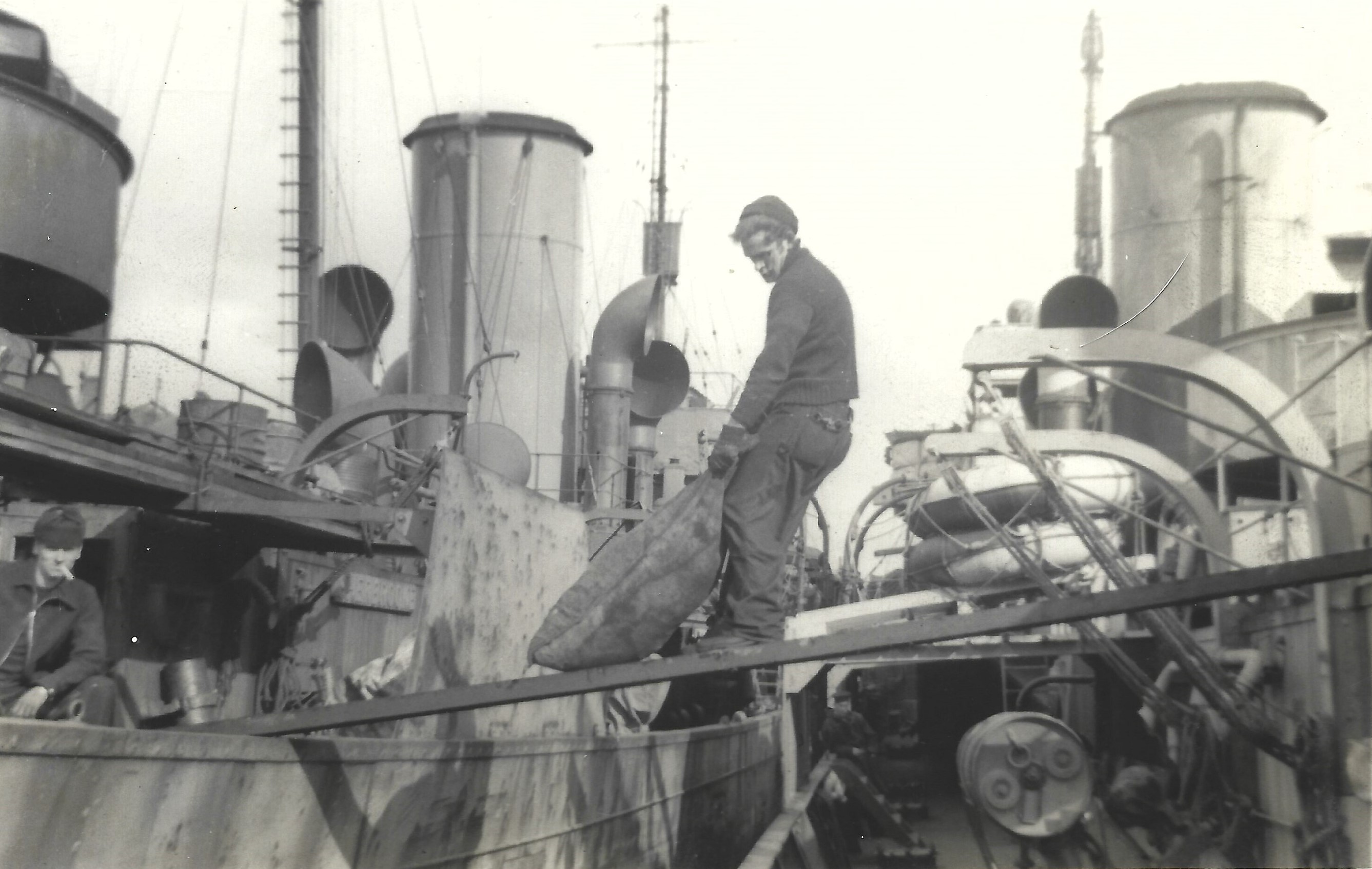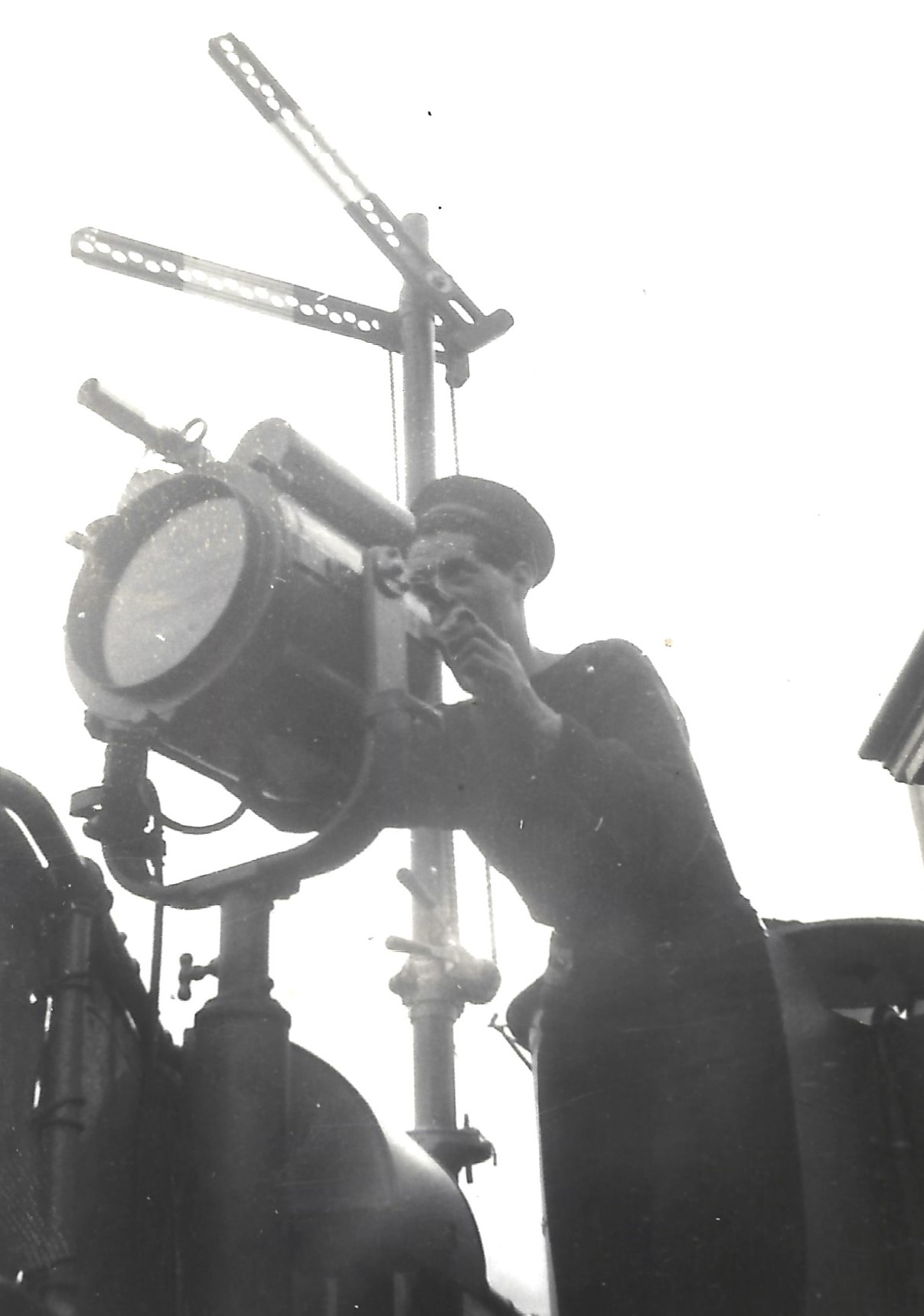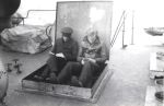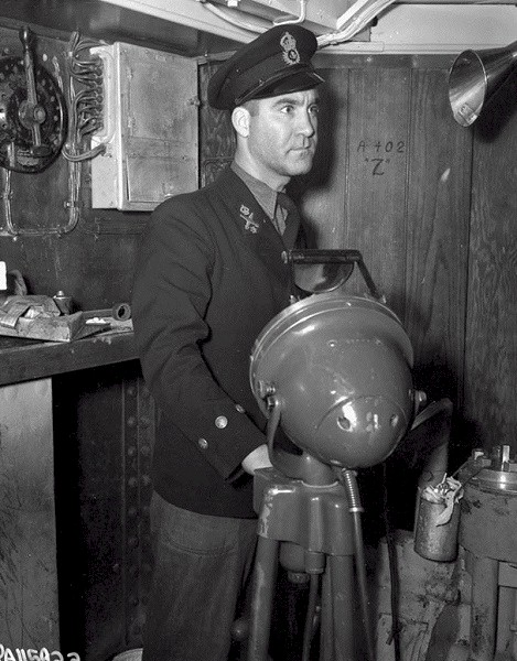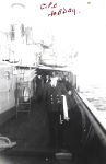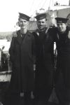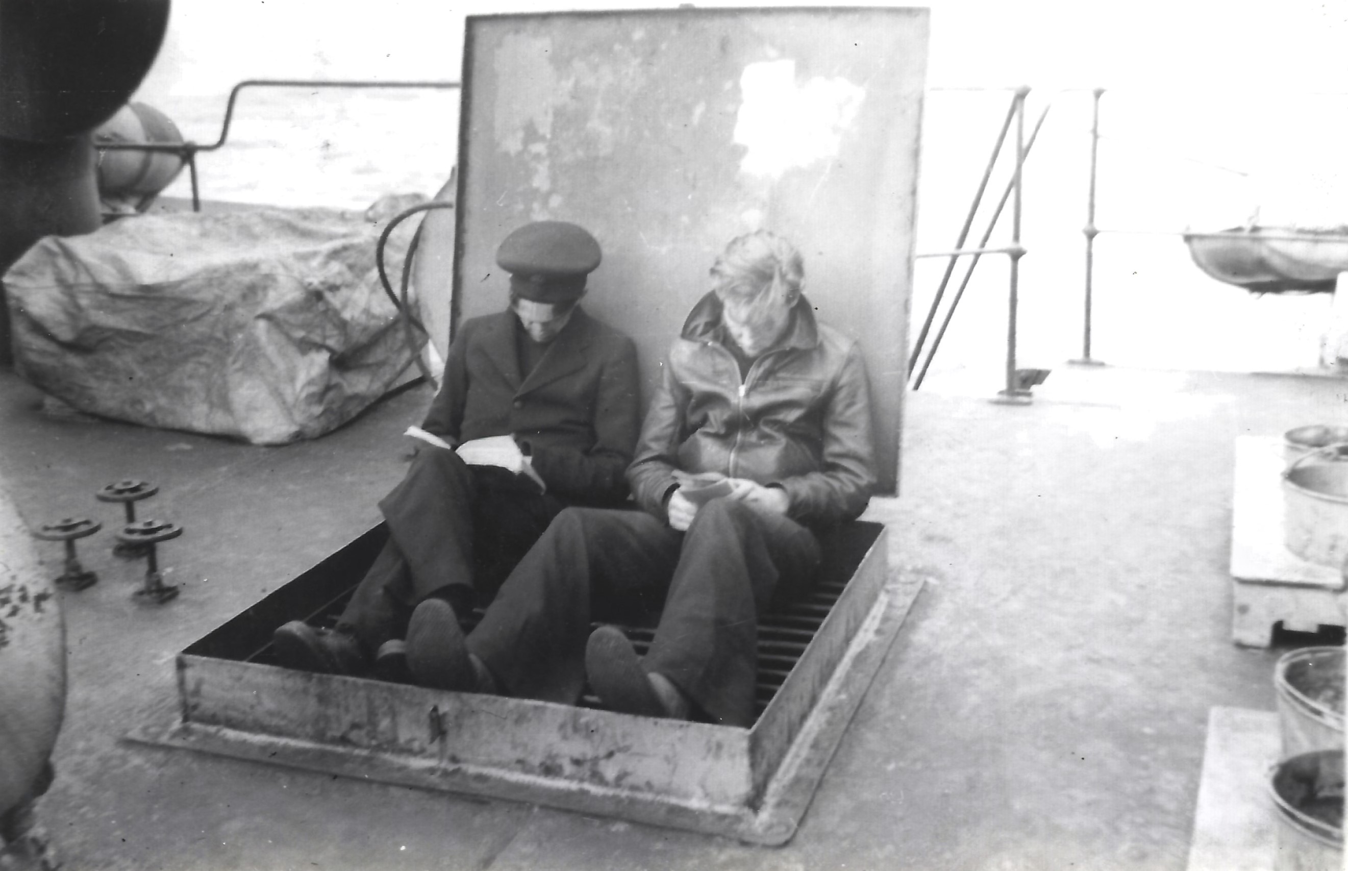 (TB40) Unknown Sig on the starboard signal light on HMCS TRILLIUM K172 (TB41) Unknown Tel or SD looking out a scuttle on HMCS TRILLIUM K172 (TB42) Chiefs and Petty Officer of HMCS TRILLIUM K172 // Identified 2nd from right - CERA James (Jimmy) Sands (TB43) Unknown officer and CPO on the lower bridge wing of HMCS TRILLIUM K172 (TB44) Two unknown sailors on HMCS TRILLIUM K172 enjoying a bit of quite time reading and keeping warm by sitting on the grate of the boiler room hatch